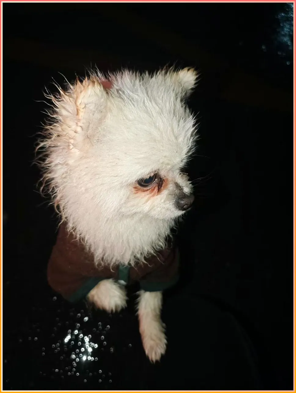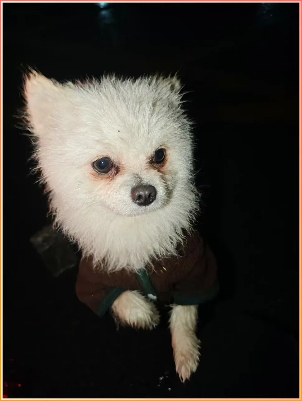那天晚上南京下雨,雨不大,但一直不停,地面黑得发亮,我本来是去给另一只住院的流浪狗送药,车开到小区北门的时候,看见路边有一团白色的小东西站在绿化带边上,一动不动,像一团被雨水打湿的棉花,也像谁随手落下的一件旧玩具,我停下来,打了双闪,走近了才发现,那是一只博美,很小,最多四五公斤,穿着一件不合身的衣服,耳朵竖着,眼睛很圆,脸上的毛已经被雨黏住了,眼角有很重的泪痕,那一刻我心里一下就沉了,我知道,这种狗不会自己出现在这种地方,它不是野外出生的狗,它是被人养过,或者至少被人关照过,只是后来没人在意了