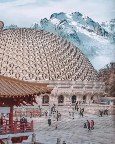 1..佛顶广场玻璃莲花:在玻璃莲花上手机贴紧地面仰拍,佛顶宫全景镜像倒影,值得收藏。