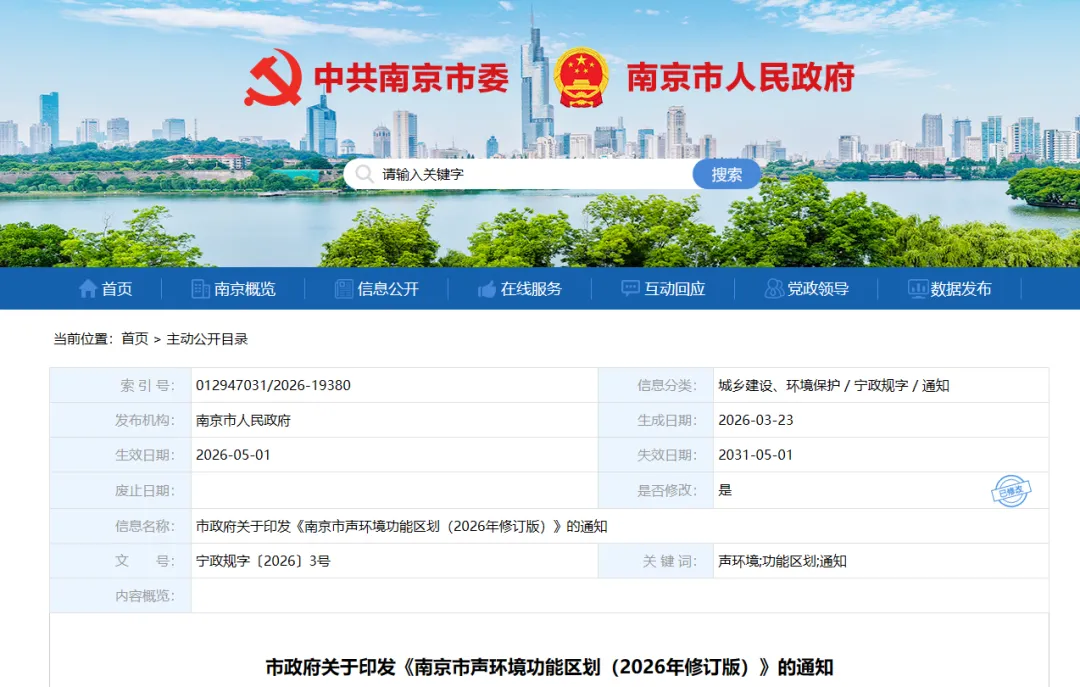 随着城市的快速发展、规划用地性质的变化以及城市空间总体规划的调整,现行《南京市声环境功能区划分调整方案(2014版)》已无法满足城市发展及环境管理的要求,根据《中华人民共和国噪声污染防治法》《声环境功能区划分技术规范》等法规政策文件要求,结合南京市城市建设发展现状及中远期规划,制定《南京市声环境功能区划(2026年修订版)》。