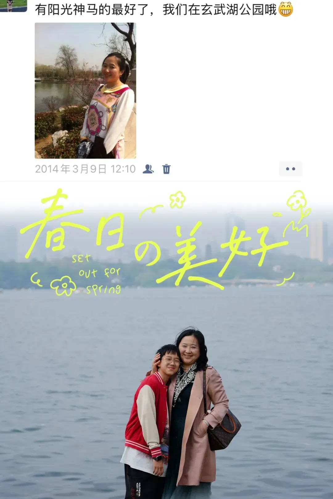 2014年3月,孕期7个月, 带着颤颤巍巍的心,每个月到南京B超复查,在那个春天的玄武湖旁发了朋友圈,仅盼娃平安落地。