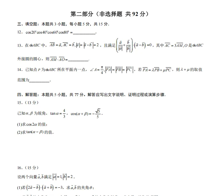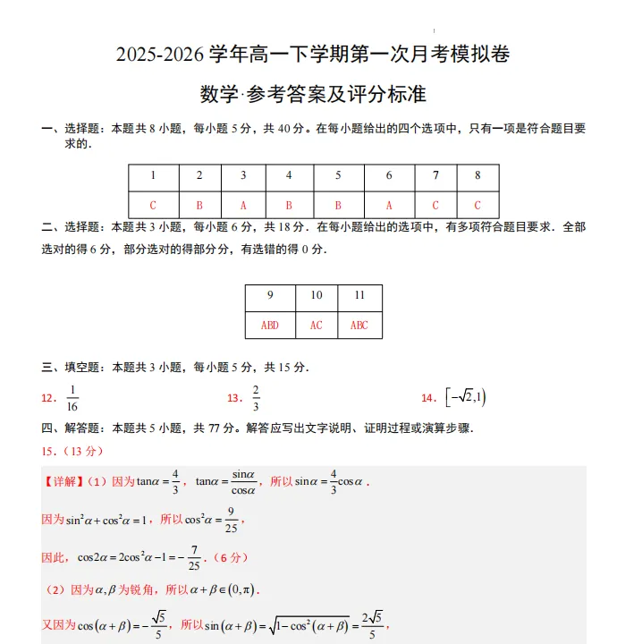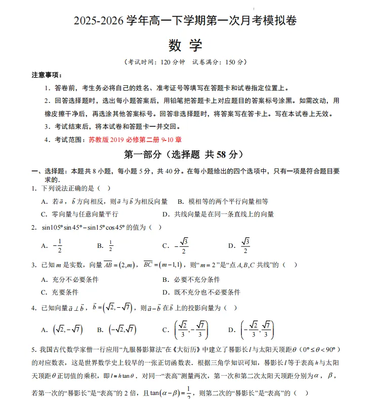 【数学+答案】2025-2026学年南京市金陵中学高一数学下学期第一次学情月考检测练习卷考试
