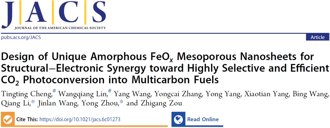 2026年04月04日,邹志刚院士、南京大学周勇、东南大学李强团队合作在Journal of the American Chemical Society期刊发表题为“Design of Unique Amorphous FeOx Mesoporous Nanosheets for Structural-Electronic Synergy toward Highly Selective and Efficient CO2 Photoconversion into Multicarbon Fuels”的研究论文,南京大学Cheng Tingting、东南大学Lin Wangqiang为论文共同第一作者,周勇、李强为论文共同通讯作者。