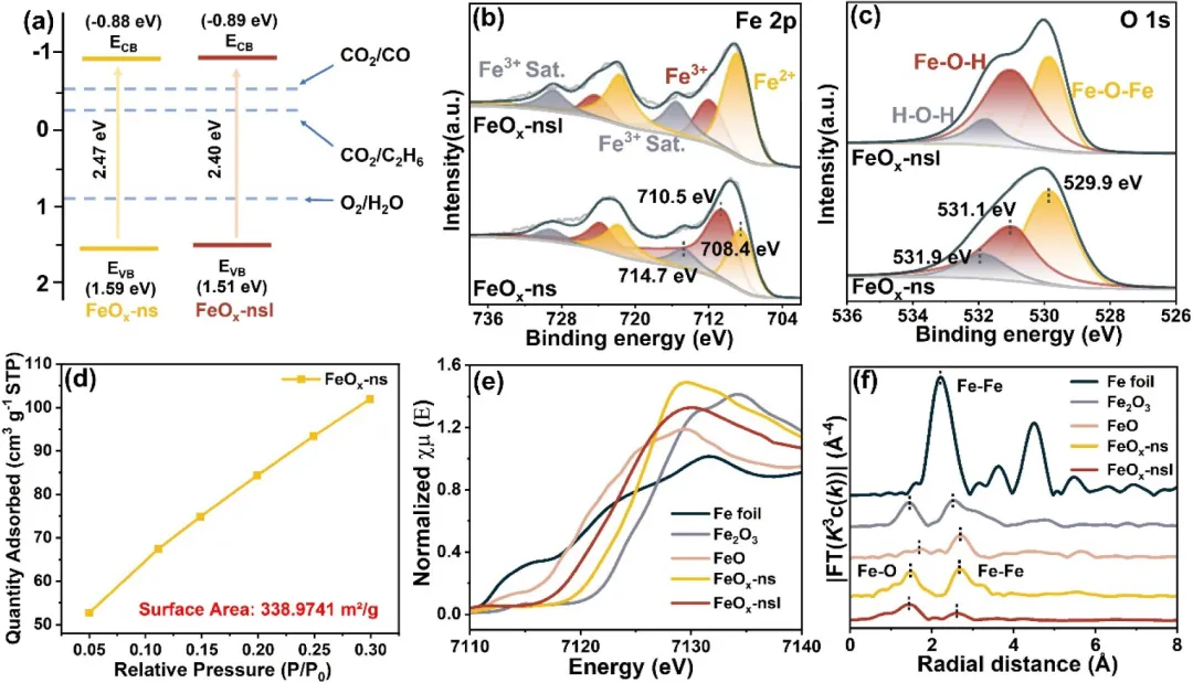 图2:(a) 能带位置图,(b) 样品的Fe 2p和(c) O 1s的XPS谱图,(d) FeO-ns的氮气吸附等温线,(e) 样品的Fe K边XANES谱图和(f) Fe K边EXAFS谱图的傅里叶变换。