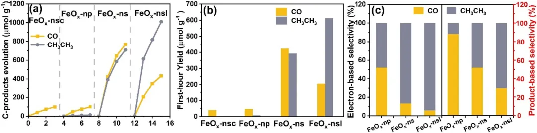 图3:(a) 含碳产物演化曲线;(b) FeO-nsc、FeO-np、FeO-ns和FeO-nsl第一个小时的光催化活性比较;(c) FeO-np、FeO-ns和FeO-nsl的基于电子的选择性和基于产物的选择性。
