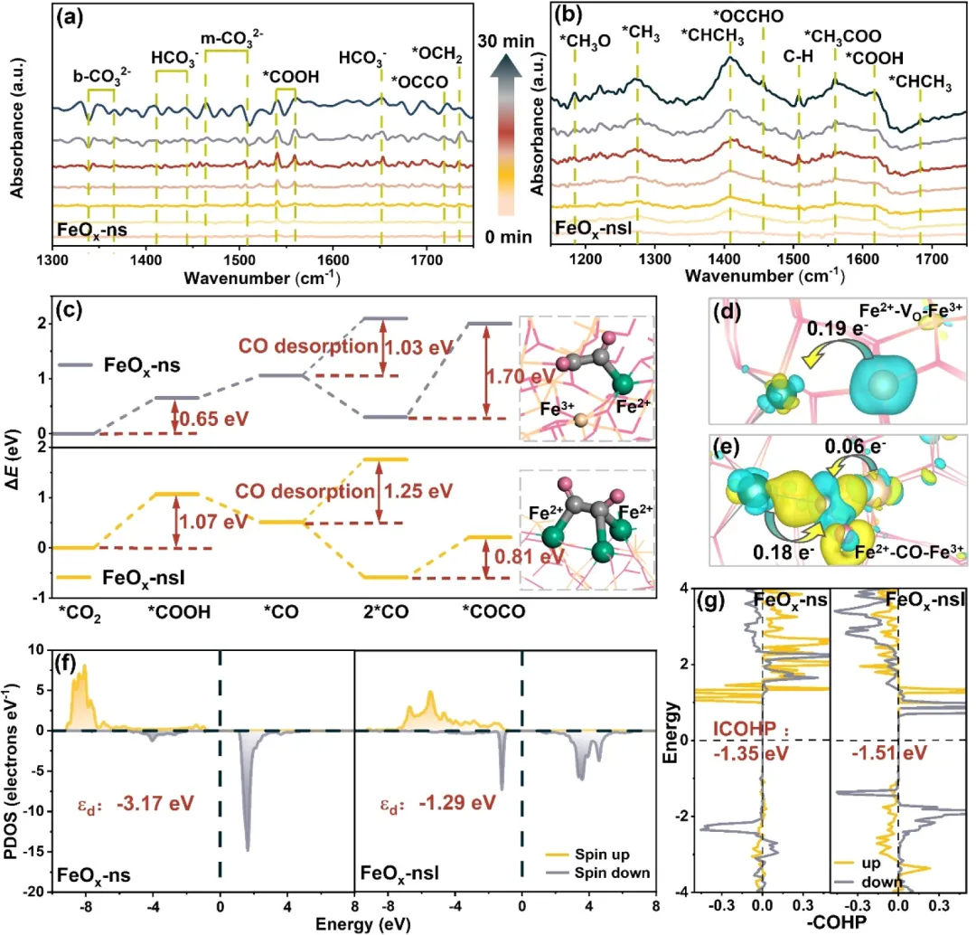 图4:(a)FeOₓ-ns和(b) FeOₓ-nsl上光催化CO₂还原的原位DRIFTS谱图。(c) FeOₓ-ns和FeOₓ-nsl上CO₂还原为COCO的反应能量变化,插图为相应的原子结构配置插图。(d) Fe²⁺-Vₒ-Fe³⁺和(e) Fe²⁺-CO-Fe³⁺结构的电荷密度差(黄色代表电子积累,蓝色代表电子耗尽)。(f) FeOₓ-ns和FeOₓ-nsl的PDOS和d带中心。(g) FeOₓ-ns和FeOₓ-nsl的ICOHP。