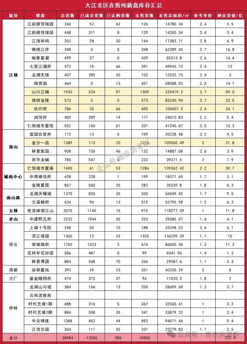盘点可知:锦绣金陵套数排江北库存第五,货值排第四!...心里有数了吧!江北新盘库存、货值、成交价汇总