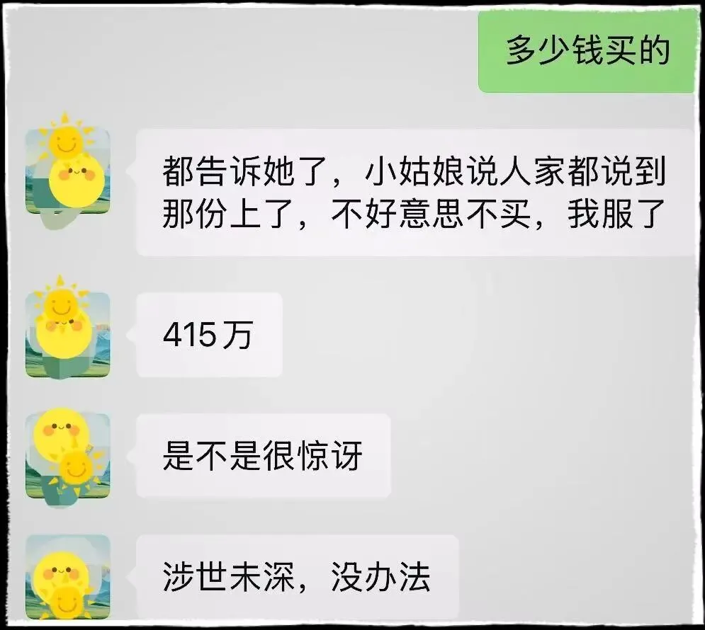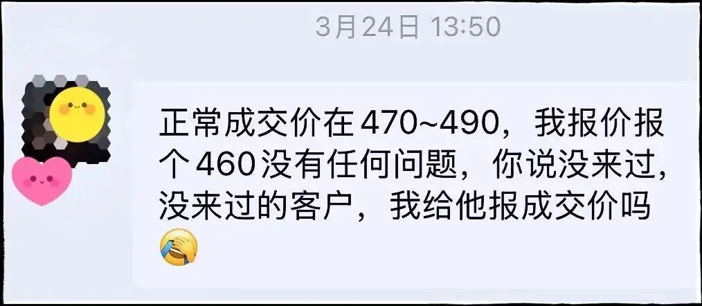 等你回去犹豫纠结,以为没占到便宜的时候,他又会悄悄联系你,语气神秘地说:“哥/姐,我跟领导申请了,420万就能卖,就这一次机会,赶紧过来!”
