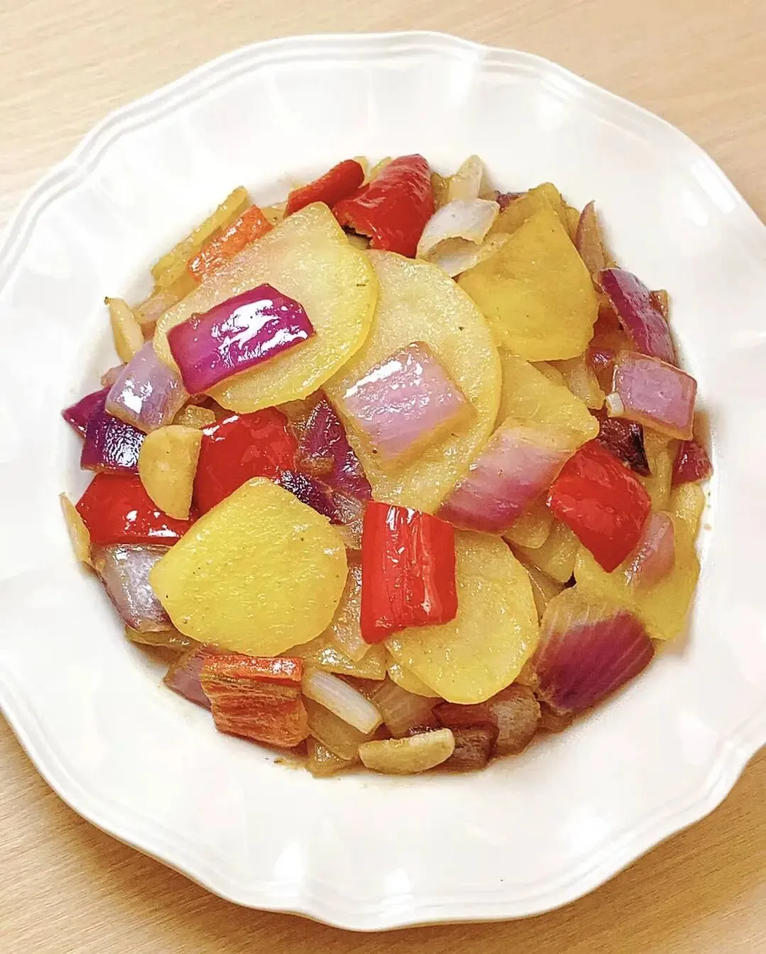彩椒洋葱土豆片、茼蒿汤