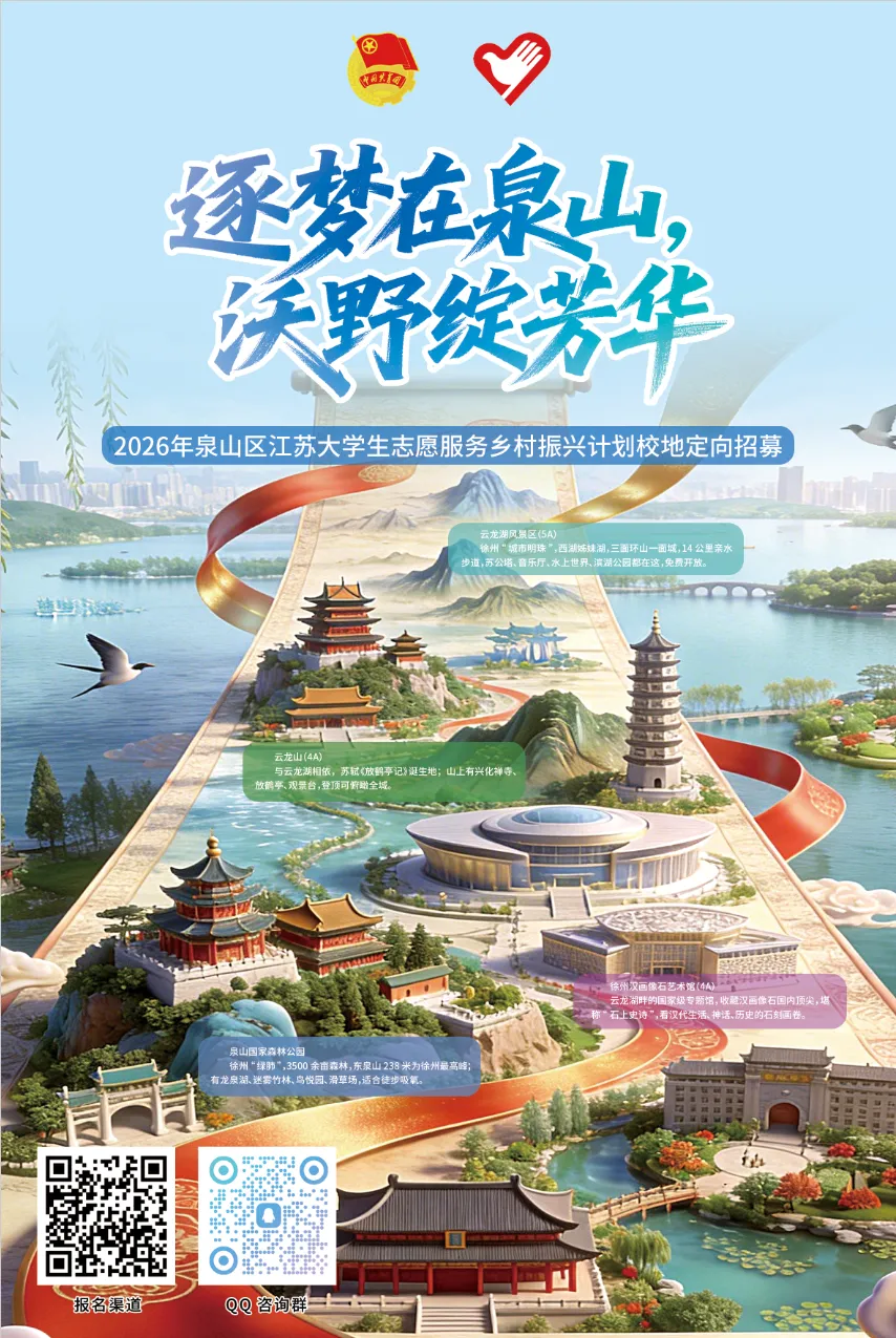 泉山区隶属于江苏省徐州市,下辖15个街道、1个镇,是徐州市三个主城区之一,也是全市经济、科教、文化、旅游和医疗中心。区域兼具山水相依的自然禀赋与核心城区的繁华便利,是徐州“一城青山半城湖”城市形象的典型代表,产业高端、创新活跃,为青年发展提供了广阔舞台。
