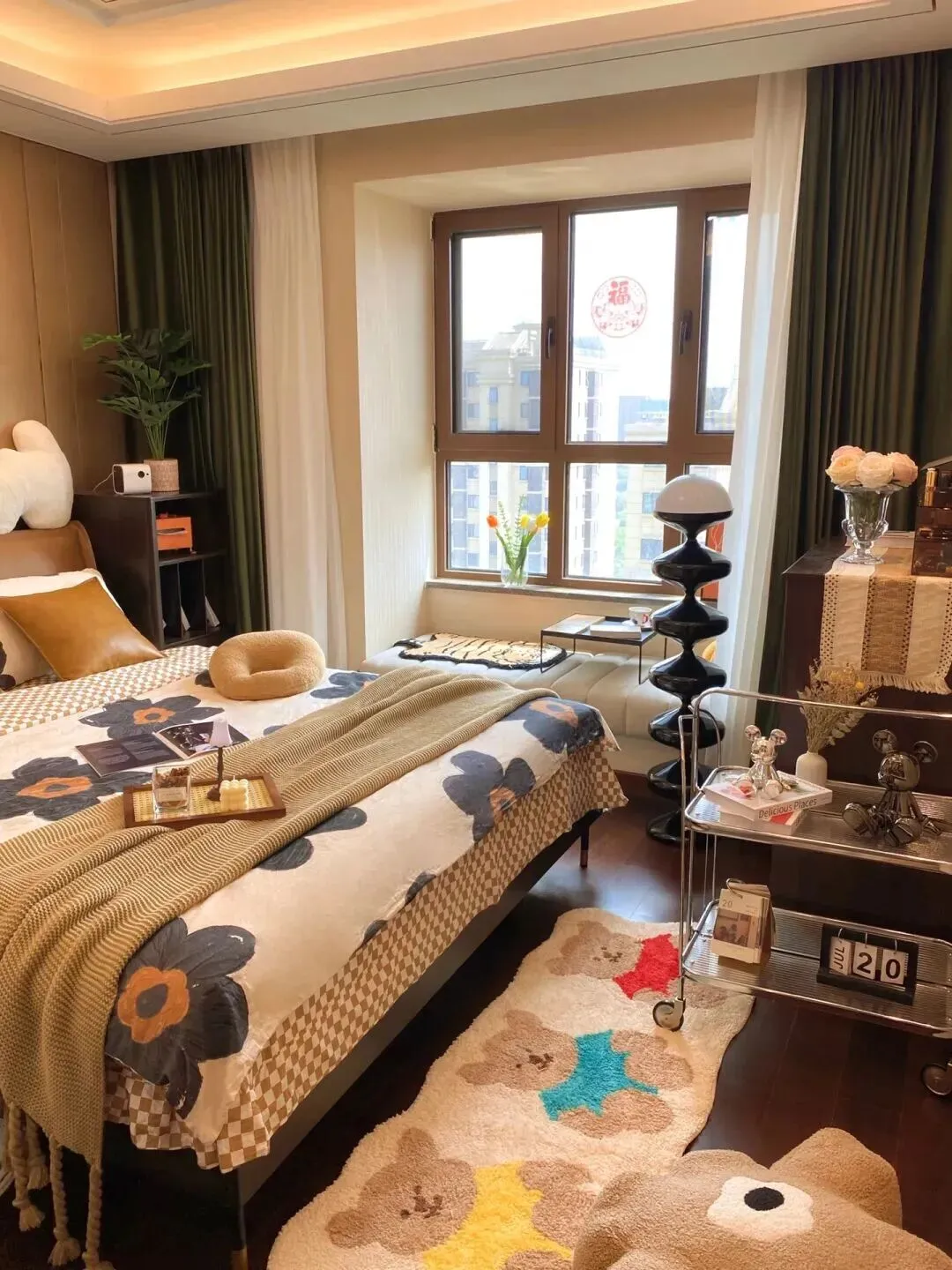 卧室的布置同样温馨,厚实的窗帘,一半墨绿一半白纱,保证了隐私,也能调节光线。