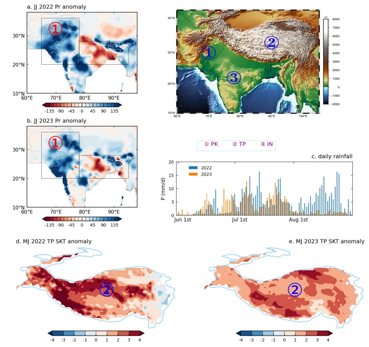 图1.2022与2023年巴基斯坦两次洪涝事件期间的6–7月CPC降水异常及同期青藏高原5–6月地表温度状况。(a) 2022年,(b) 2023年,c. 2022与2023年6–8月西印度-巴基斯坦区域(a图中框1范围)空间平均日降水量序列。d-e.基于ERA5青藏高原(d)2022年和(e) 2023年5–6月地表温度异常分布(相对于1979–2023年气候态):。a-b图中东部方框代表印度夏季风核心区,西部方框代表西印度-巴基斯坦区域WIP。