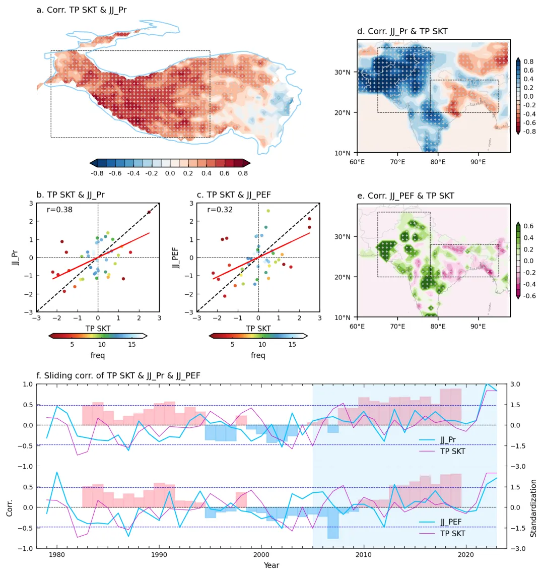 图2.青藏高原地表温度与西印度-巴基斯坦WIP区域极端降水的关系。a.前期(5–6月)高原地表温度与后期(6–7月)西印度-巴基斯坦区域标准化降水指数的相关系数分布。b-c. 1979–2023年间标准化高原地表温度指数与(b)西印度-巴基斯坦区域6–7月降水指数或(c)极端降水发生频次的散点图及回归线(红线)。d-e. 2005–2023年期间(d)6–7月降水量及(e)极端降水频次与标准化高原地表温度指数的相关系数分布。f. 标准化高原地表温度序列(红线)与降水指数/极端降水频次序列(蓝线,右侧纵轴),以及二者之间的11年滑动相关系数。(a)图中的方框标示了青藏高原中西部地区。