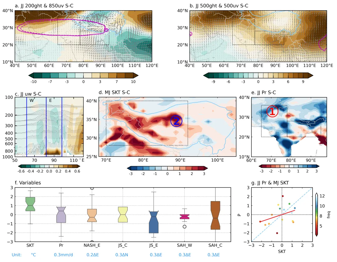 图3.CESM模拟的青藏高原中西部(70–90°E,30–40°N)5月土壤湿度减少50%对6–7月气候影响。敏感性试验减控制试验的结果:a. 200百帕位势高度及850百帕风场;b. 500百帕位势高度及风场;c. 沿20–30°N平均的垂直速度剖面(填色,负值向下)叠加控制试验中气候态纬向风的垂直剖面(箭头);d. 5–6月青藏高原地表温度;e. 6–7月降水量;f. 关键因子时序变化(包括5–6月高原地表温度、6–7月西印度-巴基斯坦区域降水量及环流因子);g. 5月高原地表温度与6–7月西印度-巴基斯坦区域降水量的关系。