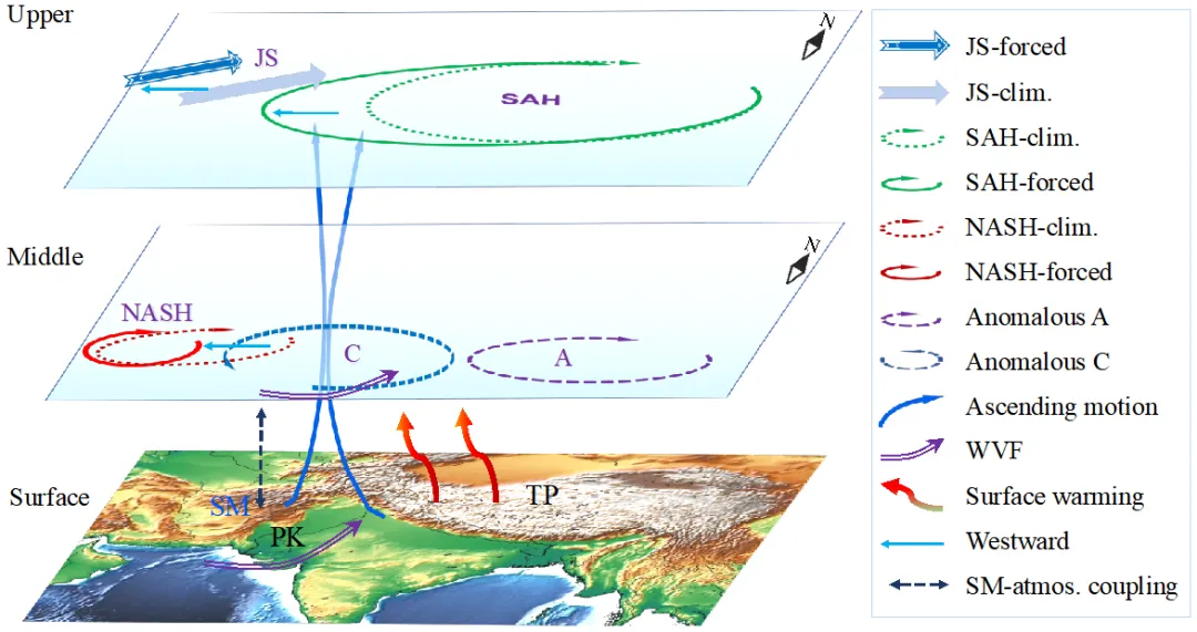 图4. 青藏高原中西部5-6月快速增温对6-7月巴基斯坦暴雨影响的示意图。其中“Clim.”与“forced”分别表示高原增温前后的状态;JS为北非副热带急流;SAH为南亚高压;NASH为北非副热带高压;WVF为水汽通量。