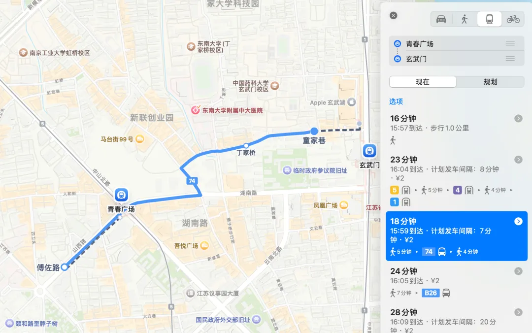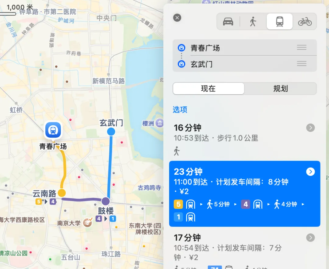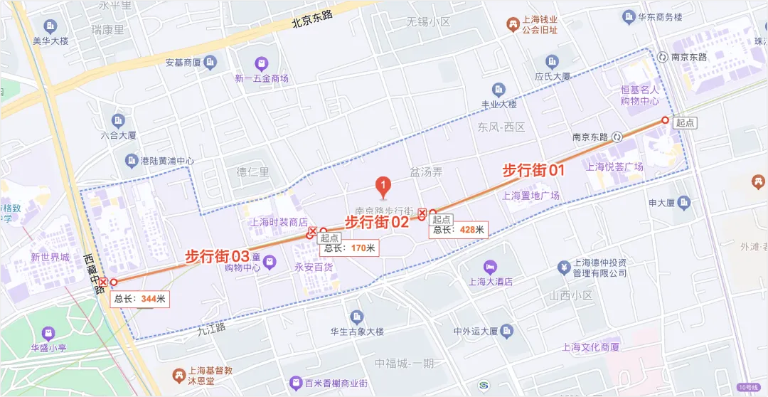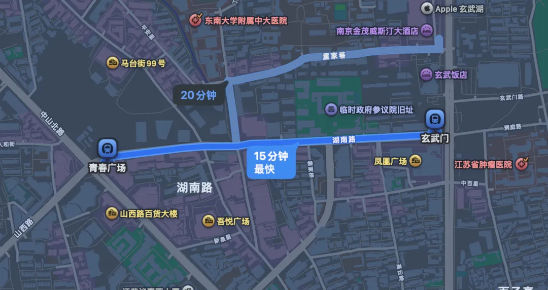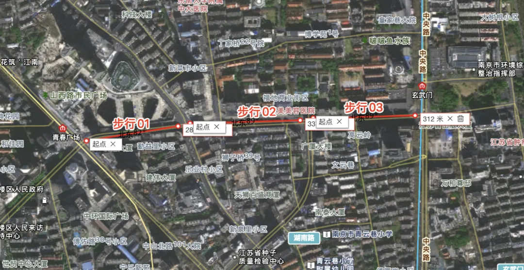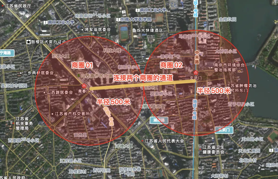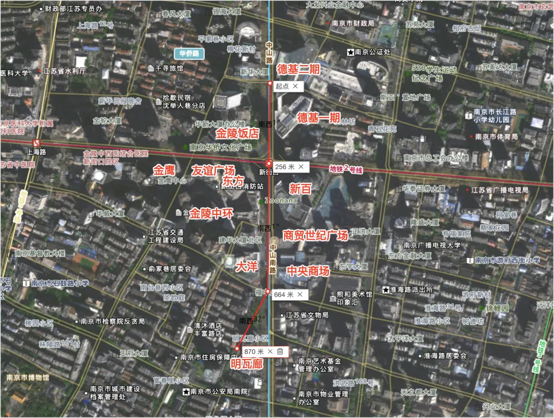 那么好好地湖南路后来怎么就衰落了呢,个人观察大体上有三个重大节点。首先是07、08年那会儿,马台街夜市没了,拆除了灯廊、巨型火炬霓虹灯等。其次是2015年,因为地下商业街的打造,湖南路进入全封闭施工阶段。直到两年后才恢复双向四车道通车。最后还有一个原因是2016年3月出的一个很重要的通知,导致湖南湖相当多的商铺后续无法继续对外提供有偿服务。多重因素下,湖南路的商业氛围肯定就慢慢弱下来了,这是显而易见的。湖南路复兴的关键大家其实都知道,一个是地下商业街、另一个就是融通的运营。地下商业街现在最大的问题是“债务-产权死结”,导致不管是续建还是放弃都很难推进。续建,这个窟窿怎么填?谁愿意接手?放弃说的简单,其实也很难操作,都已经建到这个程度了,关键这里面有非常复杂的债权和抵押情况,可以说是进退两难。在湖南路面之上留下了很多大型混凝土构件,包括通风孔、地下出入口等。而他们均大面积占据了人行道外侧的沥青道路,大家想象一下,如果没有这些遗留的体块,沥青道路的可利用宽度将比现在宽得多,就可以安排更多的机动车道、更阔绰的非机动车道或人行道。但当下机动车道数有限,非机动车道的有效宽度实际上偏窄,突出的体块如同障碍物一样,明显降低了通行的流畅感,好好的街道时不时多出一块,体验感很不好。对于部分沿街商铺而言,店门口多个大家伙显然也比较怪,遮挡了视线。而从1月网上流传的湖南路主干道市政设施改造恢复的效果图看,针对这些突出的遗留构件,更多还是视觉层面的美化。老实说就算用绚丽的灯光或屏幕包裹,依然不是根本性的解决,只能算是遮丑。但站在南京的角度来说,又何尝不是一种无奈。当然实际的效果等改造完成,我们再看,肯定比现在美观,总归是往好的方向在发展。至于湖南路大量物业转融通的运营模式,目前来看问题不大,倒是不用太担心。比如俱乐部就很顺利,该项目已被写入《2026年南京市政府工作报告》,是今年的重点推进项目之一。其实当初湖南路地下商业街想要建立地铁5号线和1号线换乘通道的设想是合理的,但其忽略了一个问题,5号线青春广场站距离1号线玄武门站的距离超过了1公里。步行约15分钟,但这不包括进出站的时间,全程步行换乘至少20分钟打底。南京南站S1和S3,与1和3号线的换乘需要经过一个长过道,这个过道总长度不会超过500米。但就是这个距离,10来分钟的换乘过程。很多人也不能接受,觉得太远太累,被很多朋友吐槽,更何况是湖南路约1公里的距离了。即便是新街口商业扎堆,大多数人的极限也就是从北端的德基广场逛到南端的大洋百货,这个距离是600多米,再远最多到明瓦廊850米也就差不多了。而且这个八百多米,是基本以新街口为中心的,单独看新街口转盘到明瓦廊也就六百多米。实际上别看新街口商业密集,但真正的核心范围也就是半径600米左右的范围。按照这个逻辑湖南路就不是一个单商圈,严格来说他应该是两个半径500米商圈的联合体。而且作为主框架的商业体都基本集中在湖南路两端,中间大多为普通的沿街商铺,这恰恰证明了双商圈的存在。搞明白这一点,我们再看湖南路,如果单纯作为连接两个商圈的通道,步行倒是可以,但如果要起到地铁5号线与1号线的通勤换乘功能,步行的效率就偏低了,疲劳感很多人是接受不了的。最好的办法就是构建特色属性的公共交通接驳线路,比如有轨电车、云轨电车、双层巴士等,再不济公交车也行。不仅完成对湖南路商业的多重覆盖,也有效实现对于青春广场和玄武门的换乘对接,属于双赢兼顾了。那么问题来了, 这两个站点之间存在公共交通的接驳吗?很可惜现实中居然没有直达的公交,步行反而是最快的,地铁最快也要23分钟,勉强能达到换乘功能的好像只有74路,离了大谱。我认为双层巴士倒是最符合湖南路气质的高品质慢速交通工具,当初完全可以颐和路-山西路-湖南路这样拉一条,一方面确实可以起到换乘的作用,另一方面也构建了一条颐和路到玄武门的旅游专线。总之青春广场-玄武门之间应该构建真正的公共交通换乘功能,这个功能没有,完全指望大家通过脚力完成换乘,这是不现实的。当然单存依靠步行的模式也不是不行,那就需要创造独特的步行体验,比如参考王府井大街或南京路的模式,将整个湖南路按照大步行街的方式塑造,其中穿插多种多样的商业要素。上海南京路是分了三段,只走人不走车,每段分别是428米左右、170米左右、340米左右。王府井大街分了两段步行街,分别长315米左右、526米左右,显然尺度都相对比较合理,而且也很有逛街的氛围。这些都是非常成功的步行街打造的模式,我认为这种模式或也是湖南路后续的突破口,当机动车的通行要素消失后,湖南路完全可以通过步行街的景观打造,尽可能的削弱地面遗留方块的视觉影响,200-300米的步行尺度也刚刚好。未来总归会越来越好,尤其是马上要打造的青春广场,还是挺令人期待的,好事多磨吧。