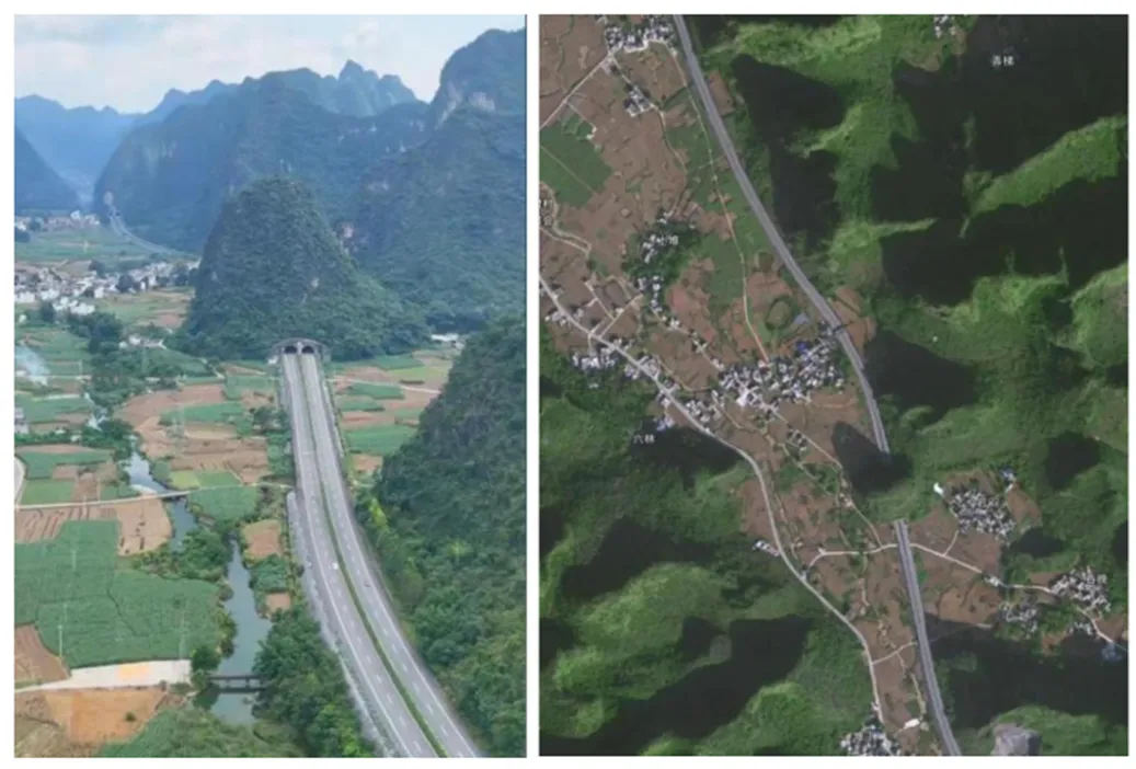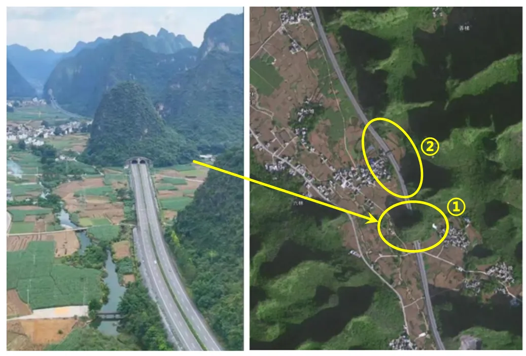 广西河都高速公路全线穿越喀斯特地貌山区。图1为该高速公路某段景观图和遥感影像图。据此完成1~2题。