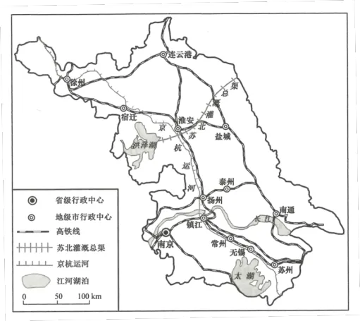 【2023年江苏卷】目前,江苏省13个设区市实现了高铁(各类型动车组)市市相通。下图为“江苏省高铁线路分布示意图”。据此完成下面小题。