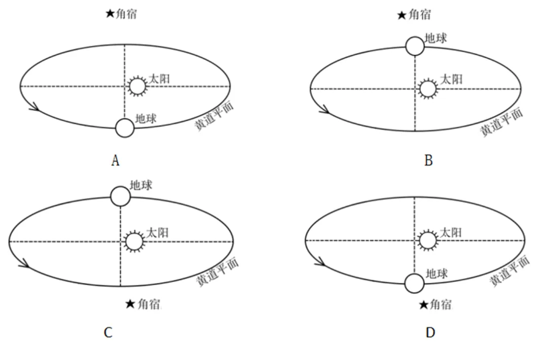 4.选项能明显看到远、近日点的区别,根据月份为3排除AC(显示未到1月近日点)。材料提及“日落后......角宿......升起”,所以角宿应位于夜半球一侧,即地球位于角宿和太阳的中间(类似满月的位置),故选B。