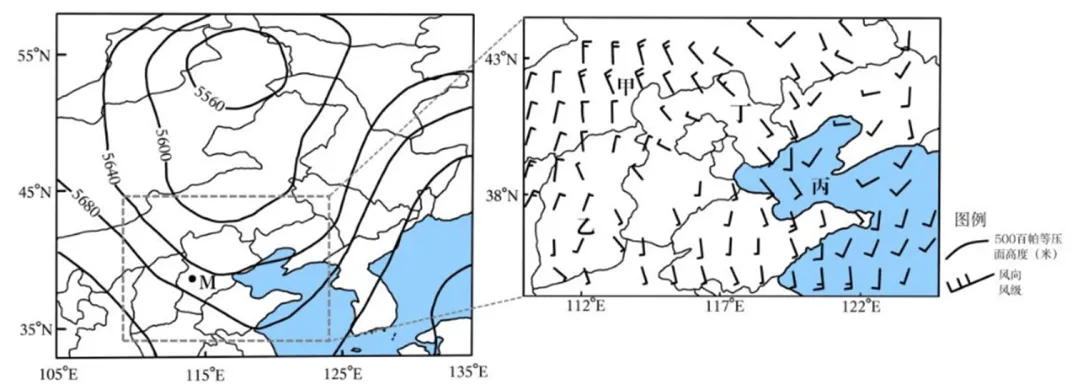 飑线是一种呈带状分布的强对流系统,多发育于冷锋锋前的暖区中。图3为夏季某次飑线发生时东亚局部地区500百帕等压面高度与近地面风场分布图。据此完成5~6题。