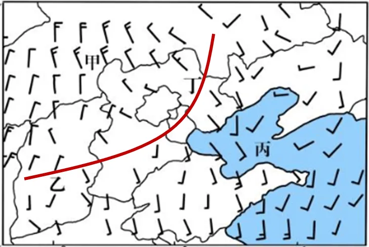 6.首先根据图中风向切变判断出冷锋位置(此考点在今年各地零模、一模中均反复出现),如下图。再根据材料提及的飑线“发育于冷锋锋前的暖区”可知为丙。甲位于冷气团一侧,丁、乙距锋线太近。