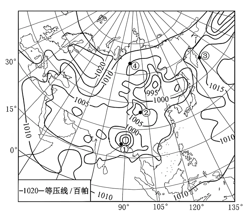 【2020年江苏卷】下图为“亚欧大陆某时刻海平面等压线分布示意图”。读图完成下面小题。