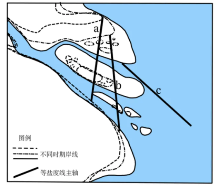 在河水、海水相互作用的过渡地带,会出现咸淡水混合现象。图4示意16世纪至20世纪长江口附近的岸线变迁,以及该时段6‰—10‰等盐度线主轴变化。据此完成7~8题。