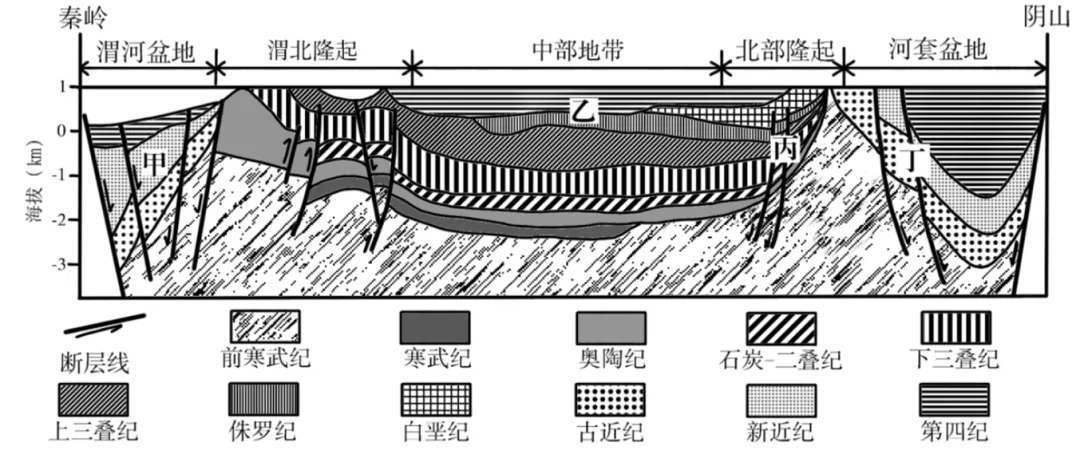 陕甘宁及内蒙古地区天然气资源丰富,集中形成于古生代。图5为该区域南北向地质剖面图。据此完成9~10题。