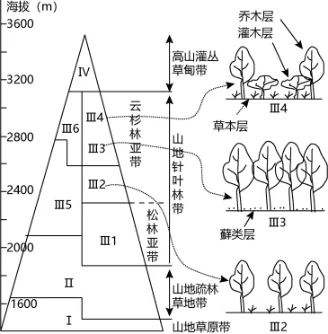 【2023江苏卷】下图为“我国某山地垂直带谱及云杉林亚带的植被垂直分层示意图”。据此完成下面小题。