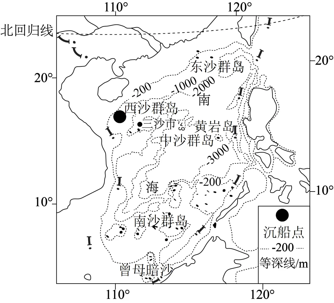 【24-25上苏州期末零模】2022年7月,我国“深海勇士号”载人潜水器发现并确认了位于南海北部的多处沉船。其中,南海陆坡一号、二号沉船沉没于明代,一号沉船货物以瓷器为主,二号沉船满载进口的乌木。图为“沉船位置示意图”。据此回答下面小题。