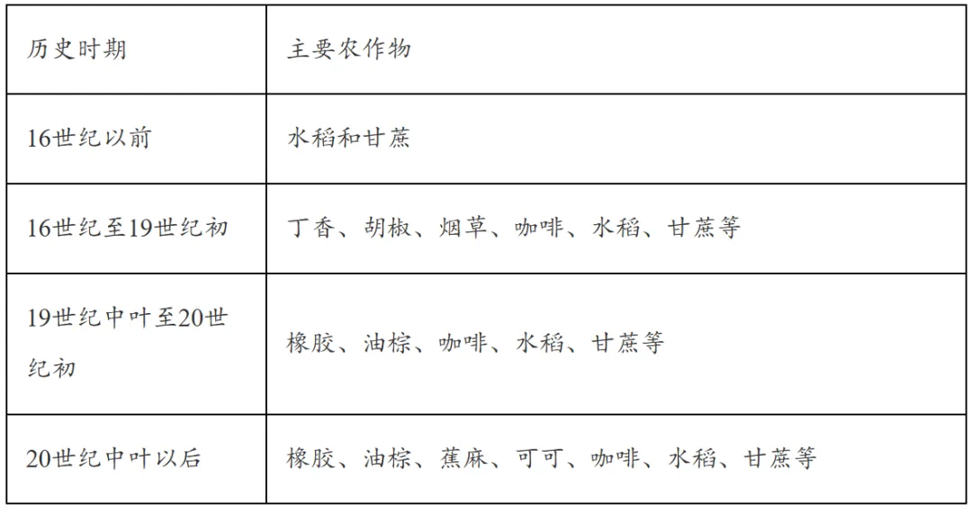 【2025江苏卷】东南亚农业种植结构受多种因素影响,不同历史时期发生了多次变化。下表为“东南亚不同历史时期种植的主要农作物”。完成下面小题。