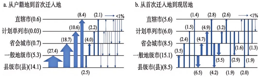 图8示意截至2017年中国流动人口多次迁移格局,其中箭头宽度与迁移数量呈正相关,不同行政等级城市旁的括号内数字为同级迁移占比。据此完成16~17题。