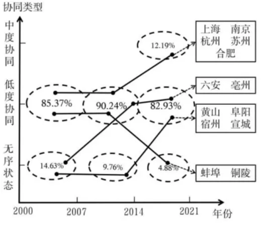 协同是推进城市经济系统有序发展的重要路径。图10为2000—2021年长三角地区城市经济协同类型演变模式图(百分比为某类协同的城市数量占区域城市总数量的比重,折线与箭头代表不同的演变过程及对应城市)。据此完成21~22题。