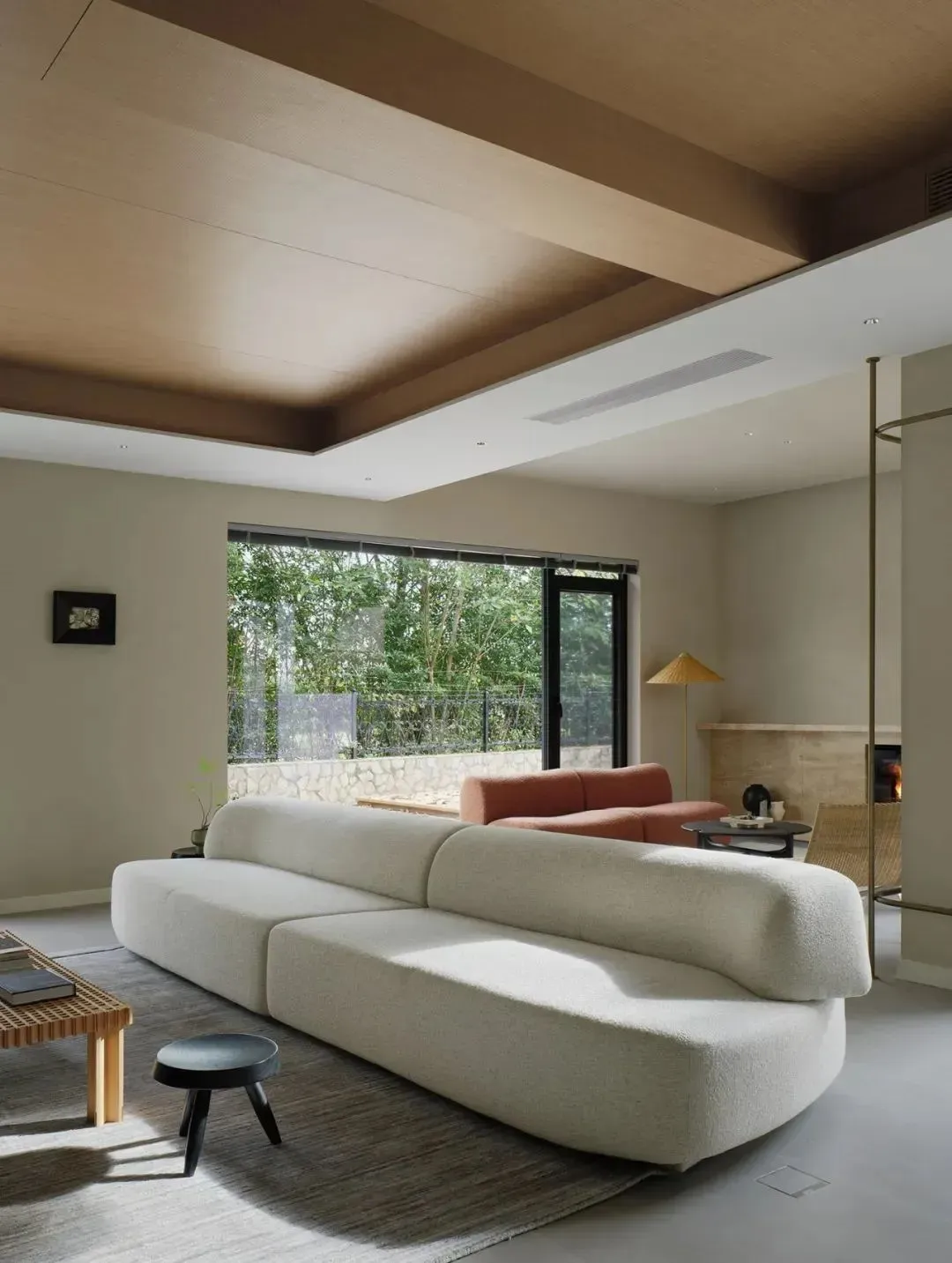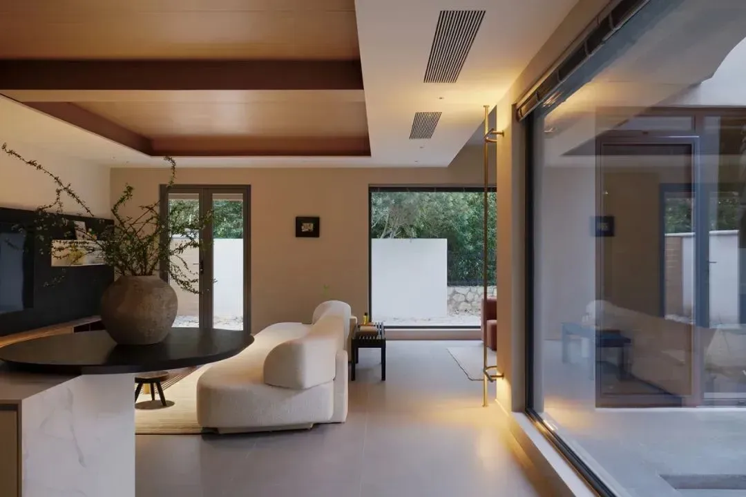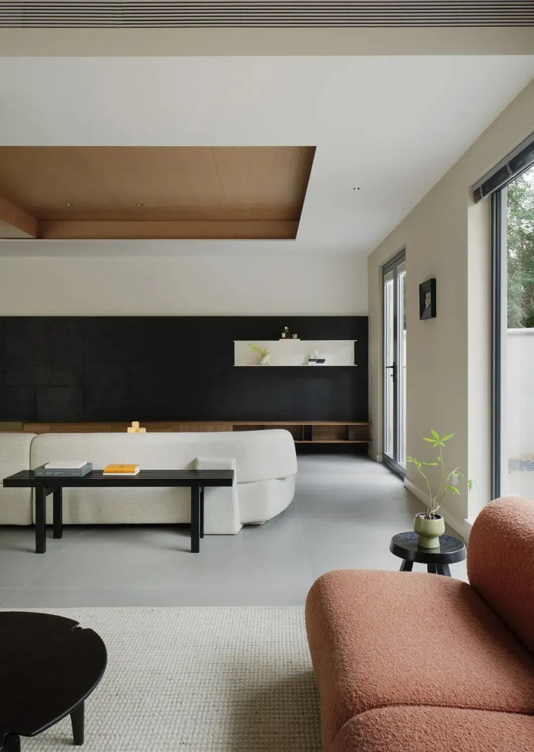 The white modular sofa is selected in the center of the living room to weaken the sense of oppression in the space with a low volume. The whole french window introduce natural light and outdoor green into the interior, making the landscape a part of the space rather than an additional decoration.