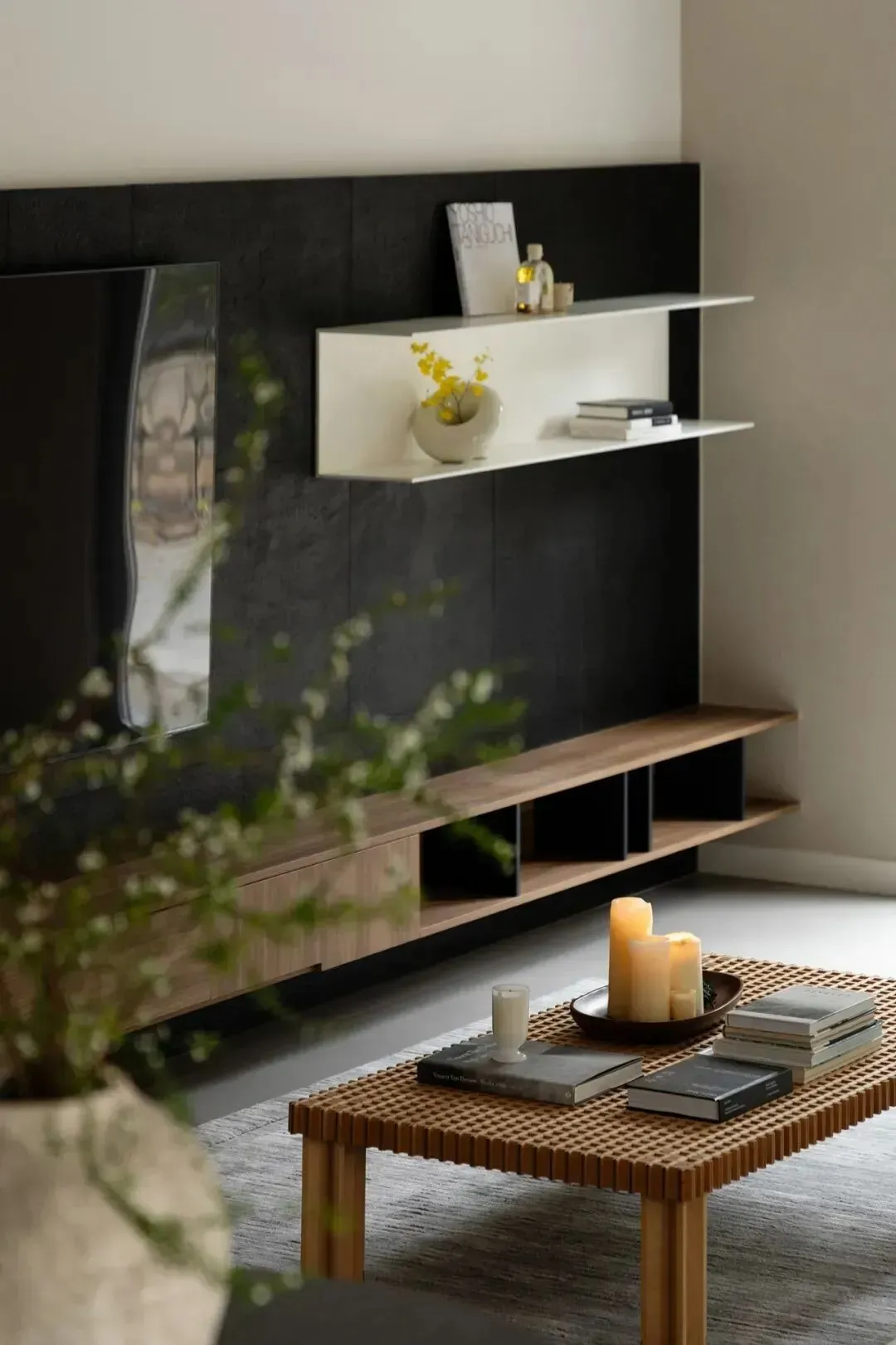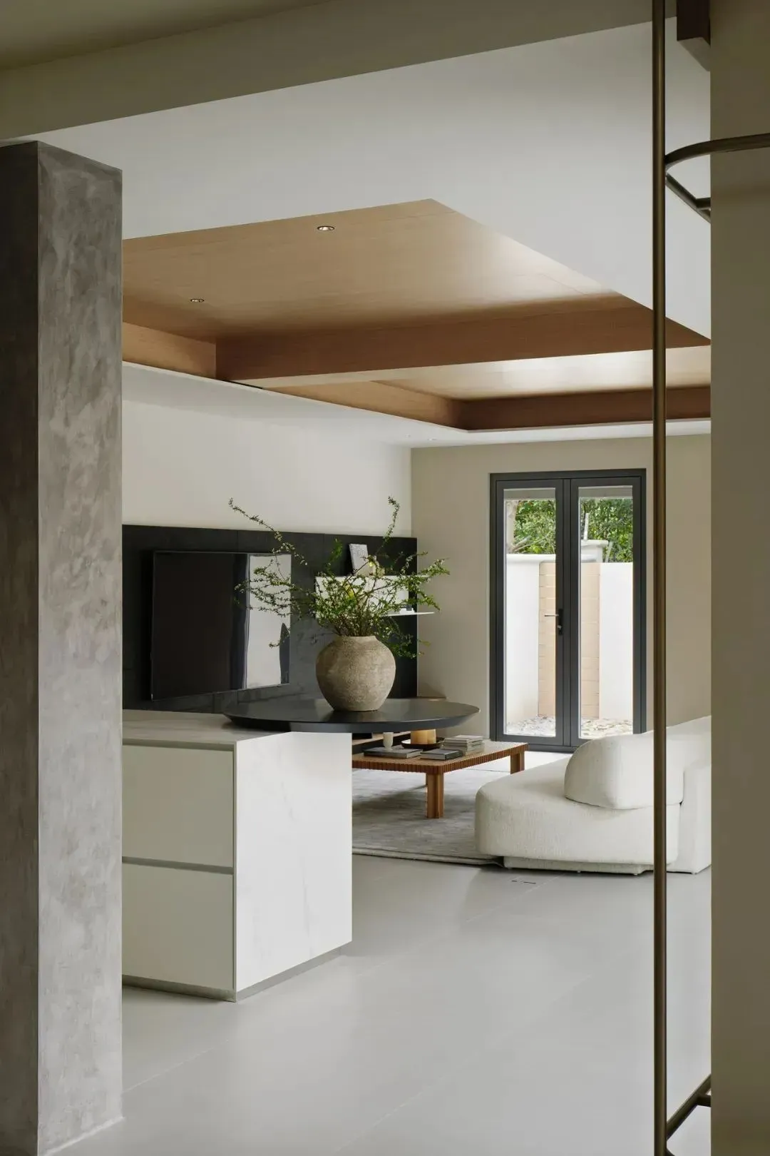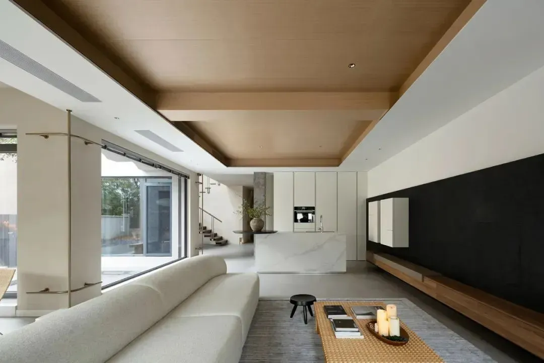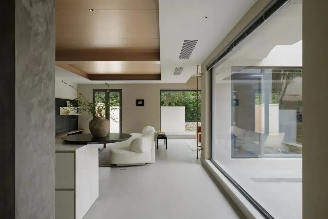 The white modular sofa is selected in the center of the living room to weaken the sense of oppression in the space with a low volume. The whole french window introduce natural light and outdoor green into the interior, making the landscape a part of the space rather than an additional decoration.