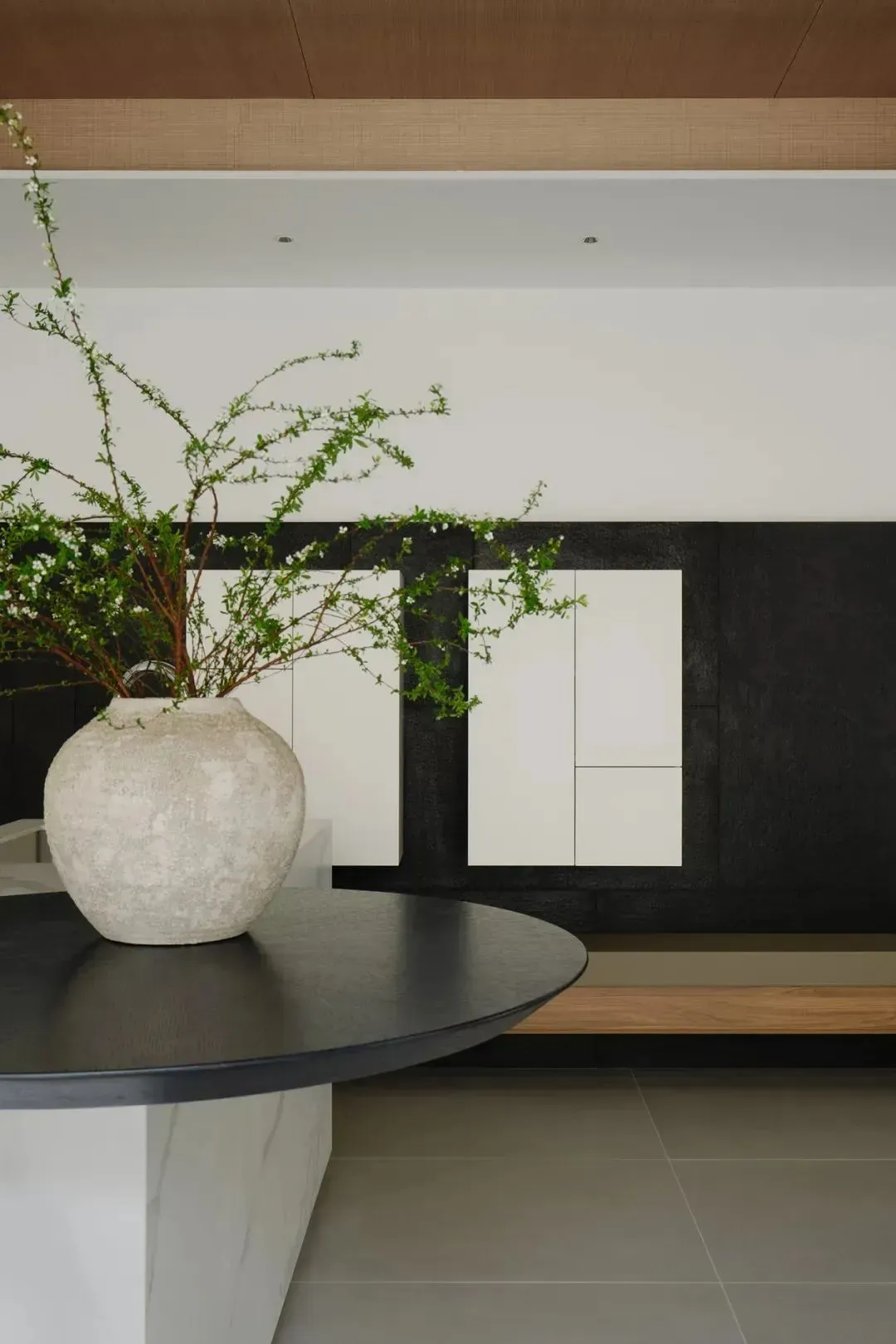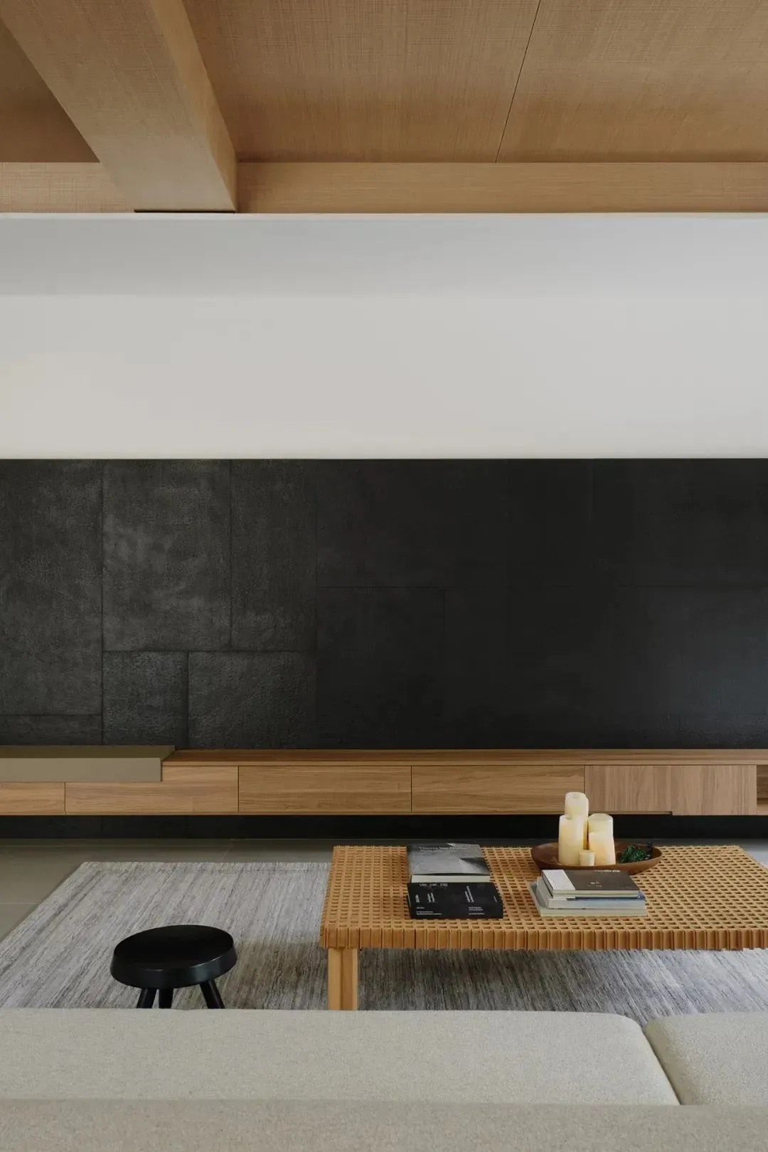 空间中的视觉重心落在一整块未经过度加工的黑色天然石材上。材质本身的原始状态被完整保留,成为连接室内空间与自然语境的重要媒介。