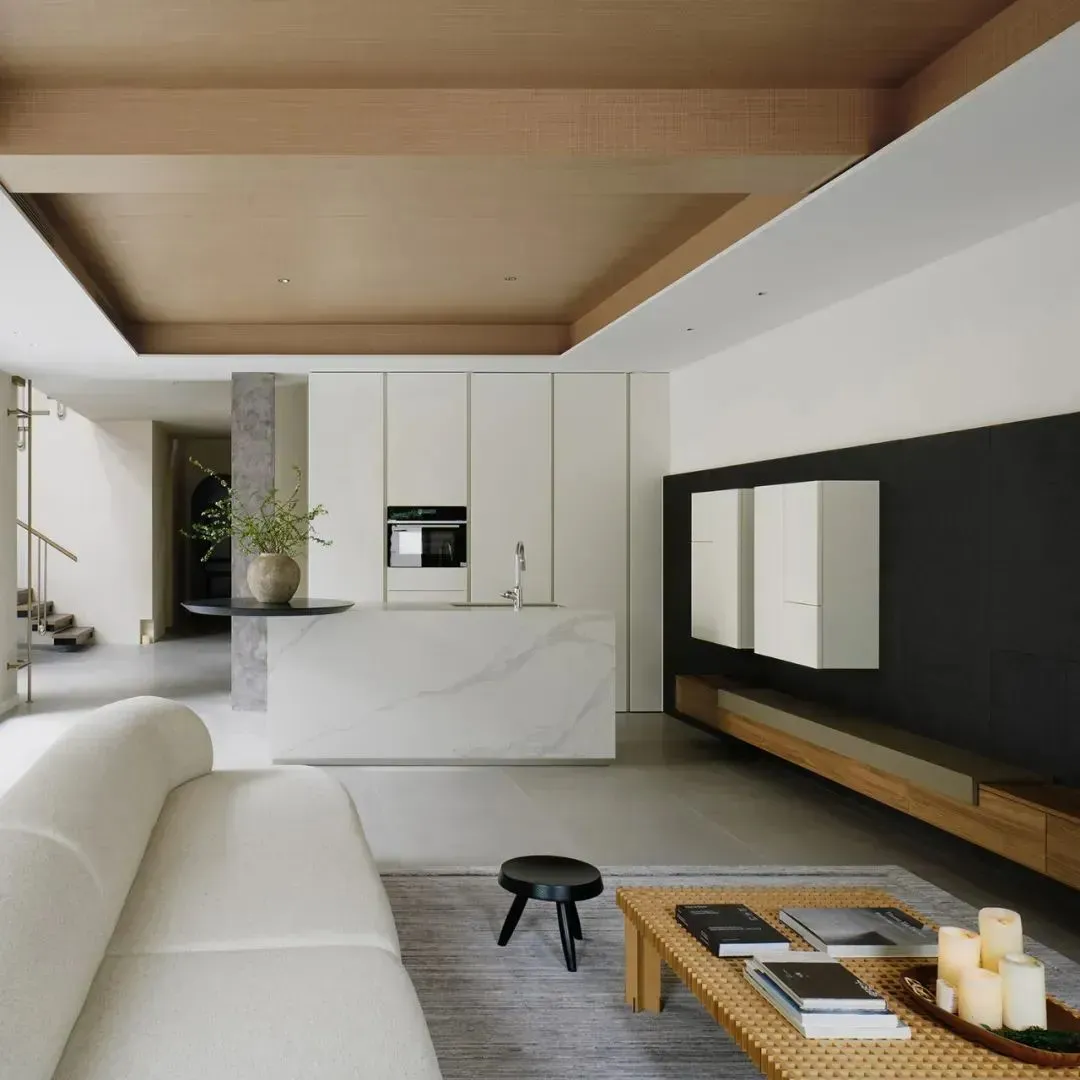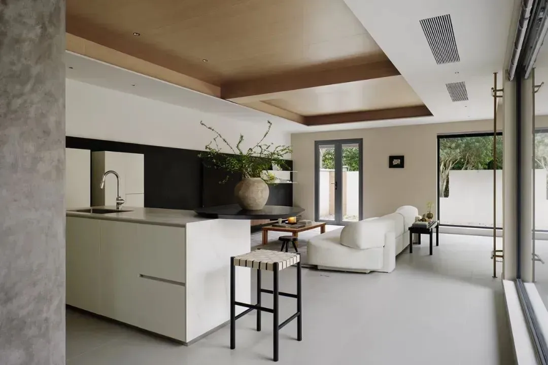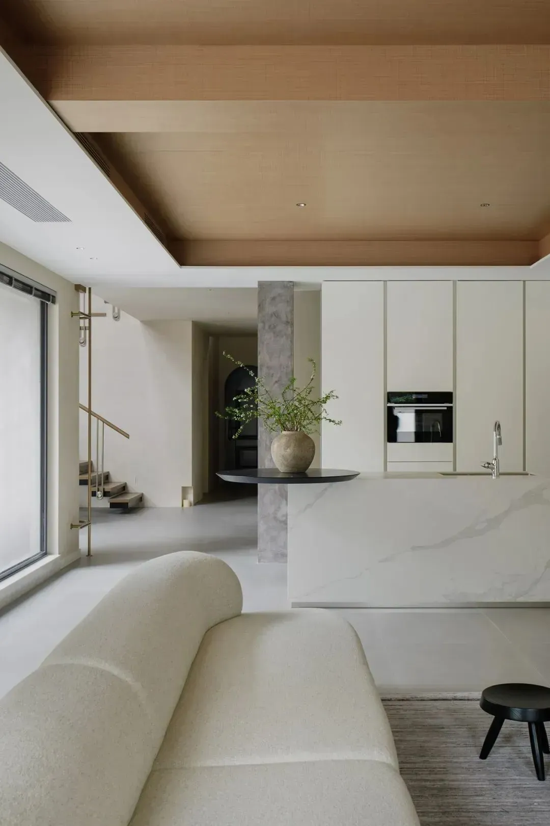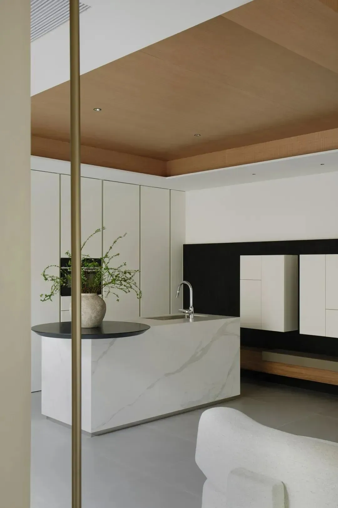 The kitchen connected to the public area follows the design principle of "less is more". The pure white cabinet and grey marble countertop form a clear contrast, and the functionality and visual hierarchy are synchronized. The hidden storage system keeps the countertop tidy, while the presence of the island platform further enhances the interactive nature of the space.