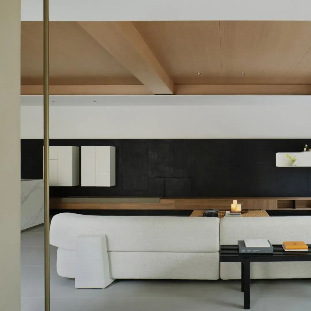 客厅中央选用白色模块化沙发,以低矮体量弱化空间的压迫感。整面落地窗将自然光线与室外绿意引入室内,使景观成为空间构成的一部分,而非额外装饰。