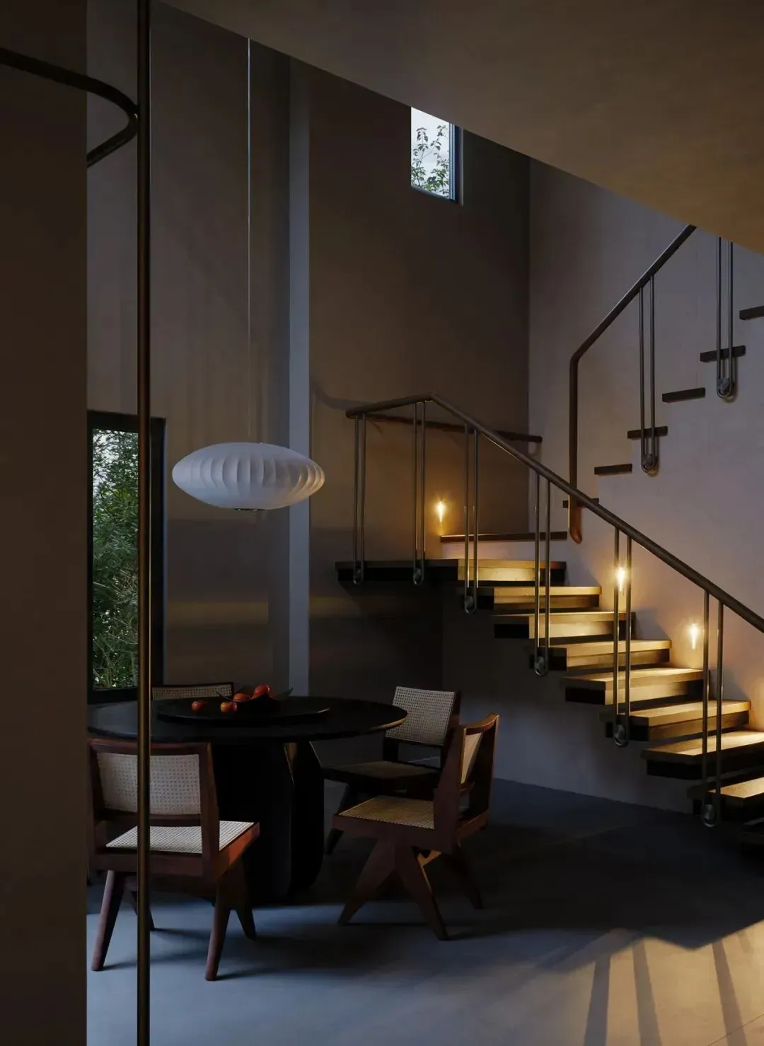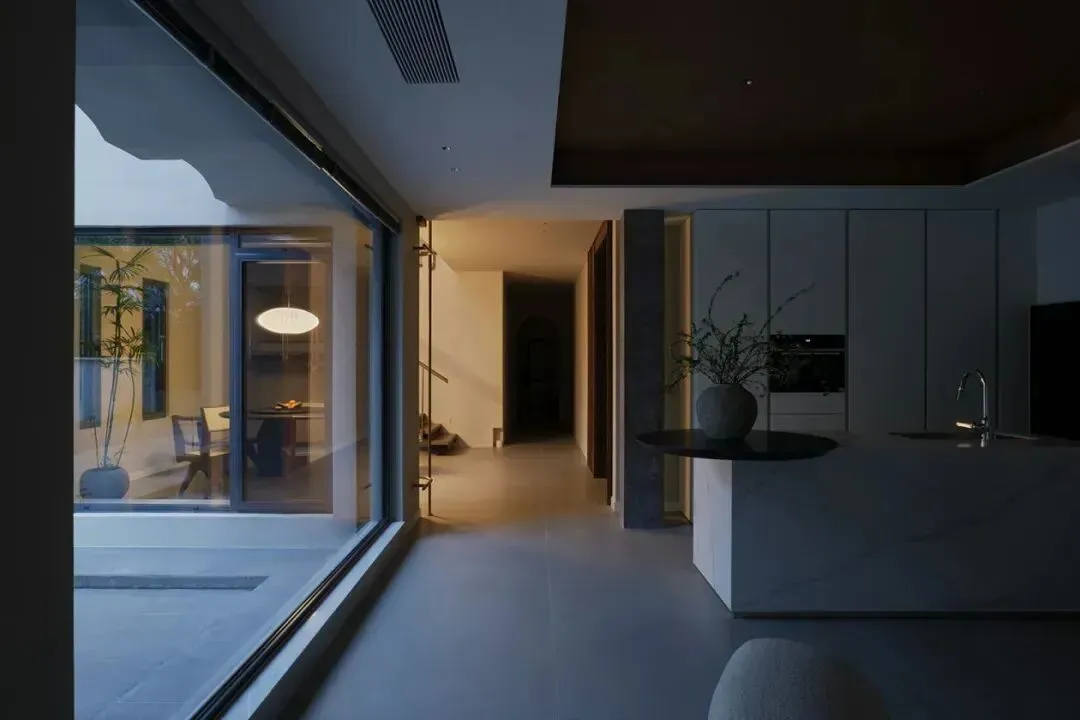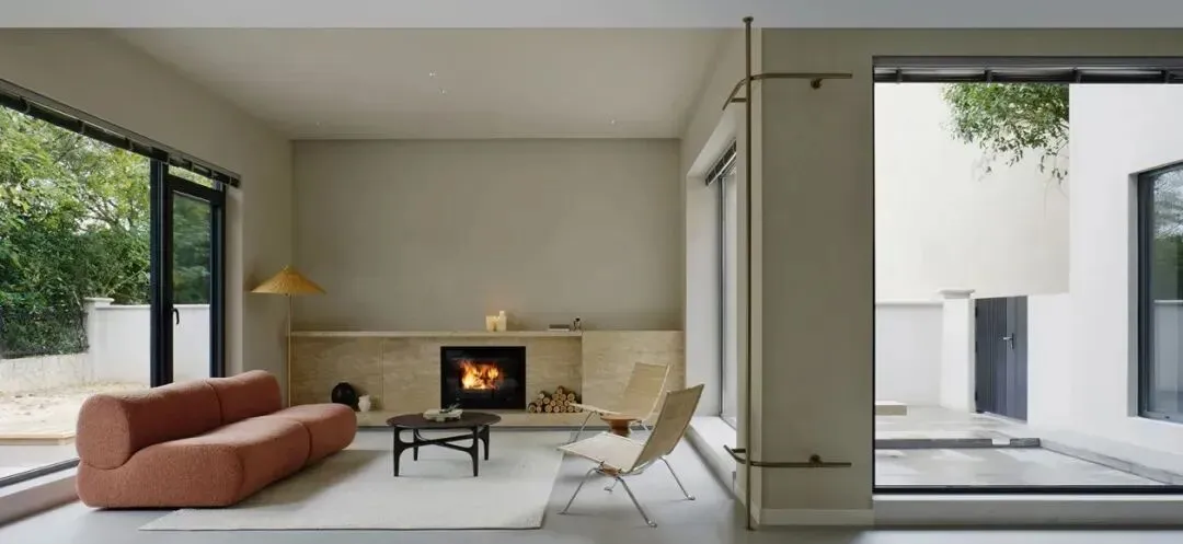 After nightfall, the warm light released by the fireplace slowly spreads indoors, and the flames reflect on the walls, changing the layers accordingly. Through the glass curtain wall, the greenery in the courtyard maintains a restrained and quiet presence, creating a clear distinction between outdoor calmness and indoor temperature, and enhancing the emotional stability within the space.