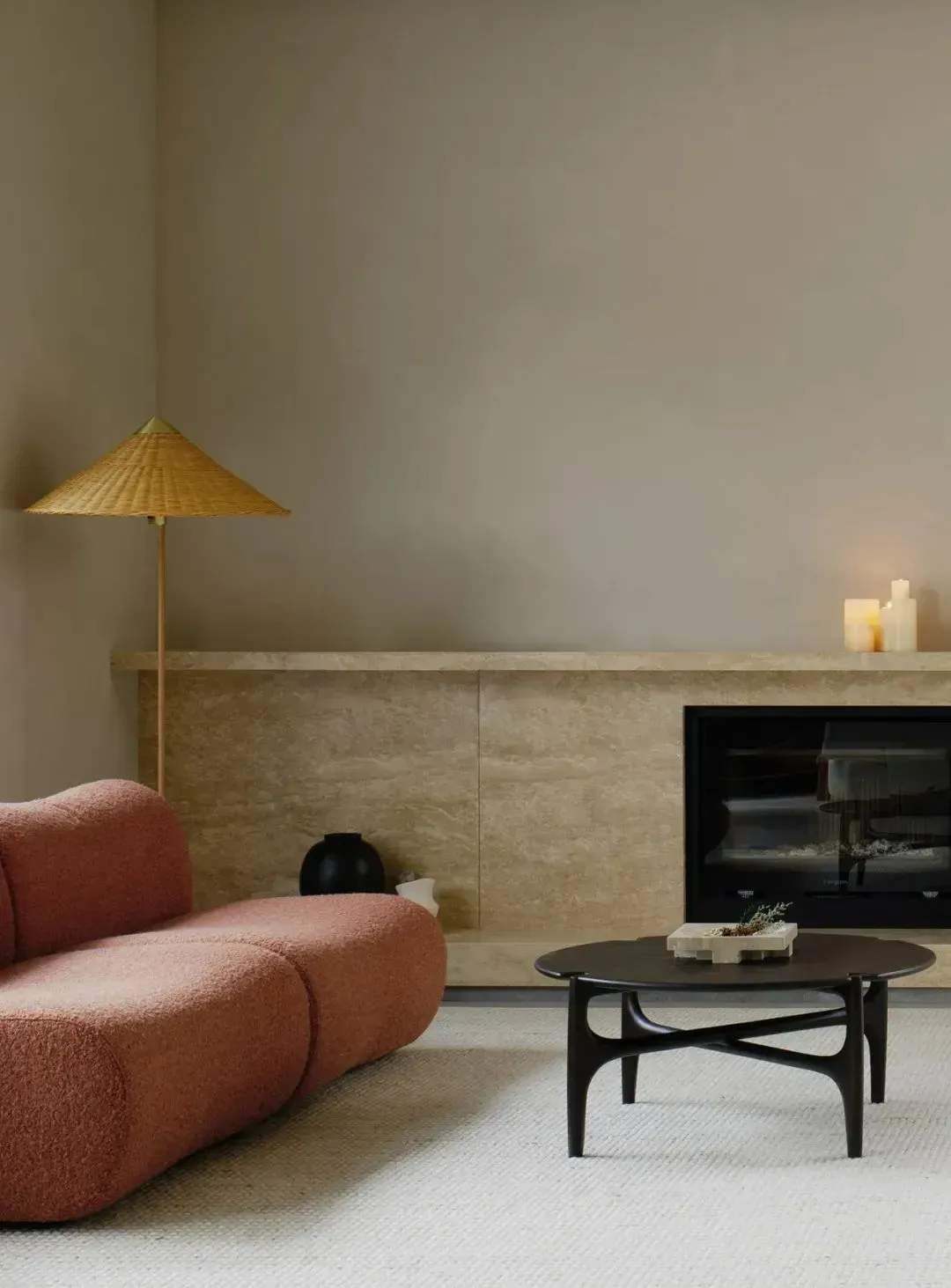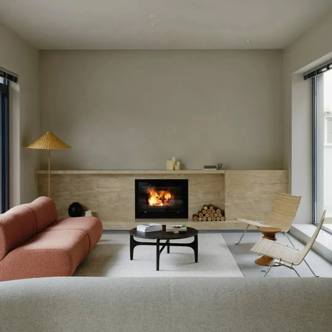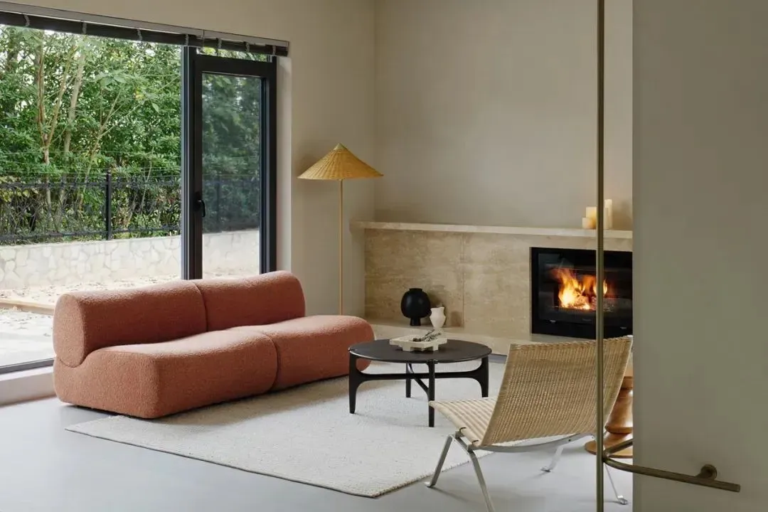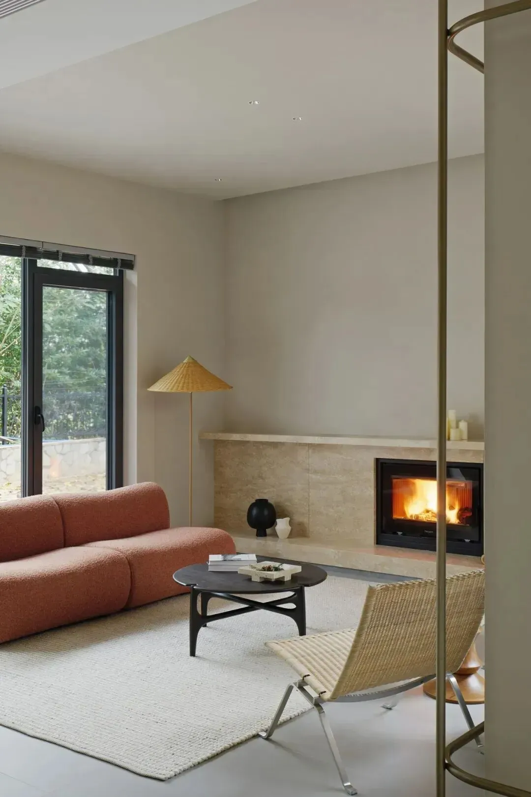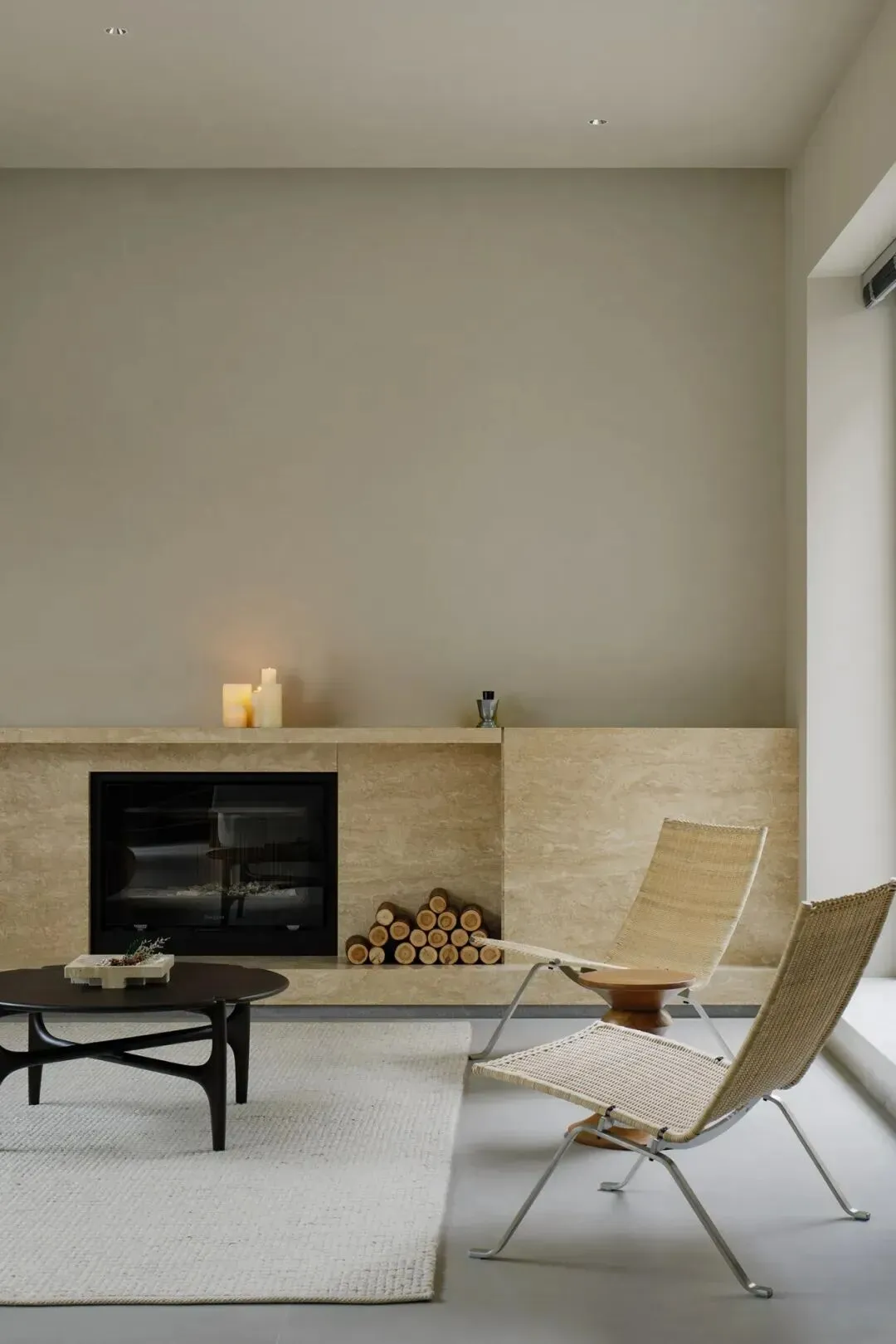 以天然洞石构筑的现代壁炉成为空间中的重要节点,粗粝的石材肌理与火焰本身的温度形成鲜明对照,在原始质感与当代设计之间建立起稳定而直接的关系。