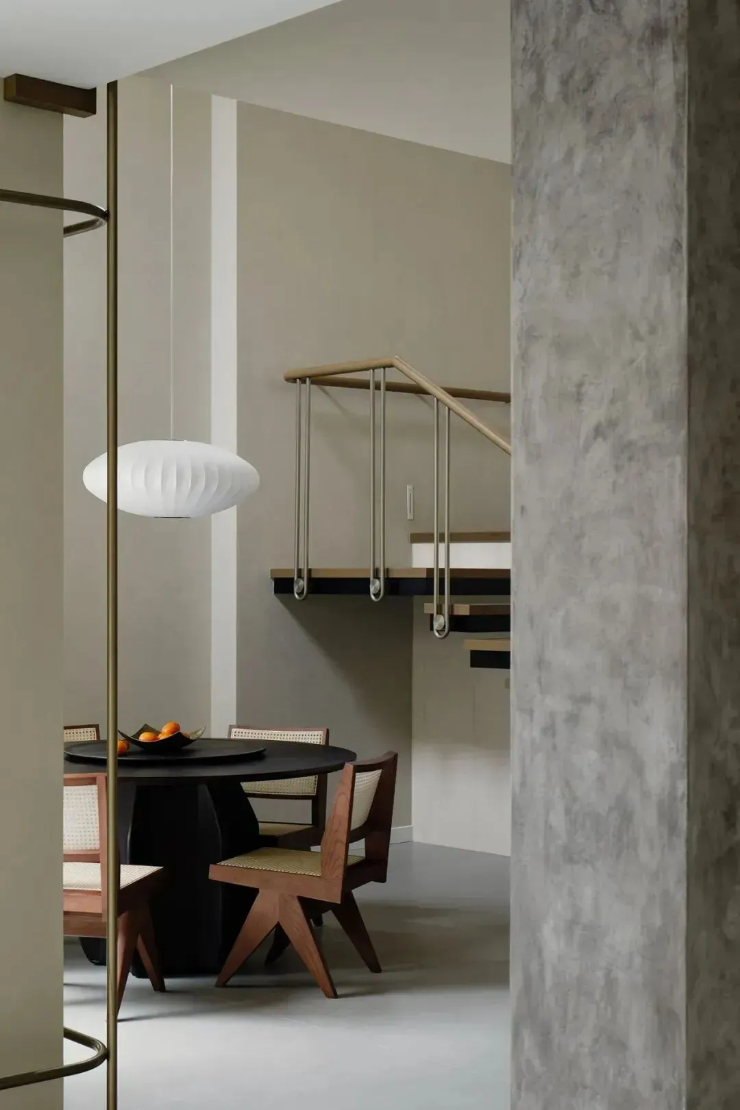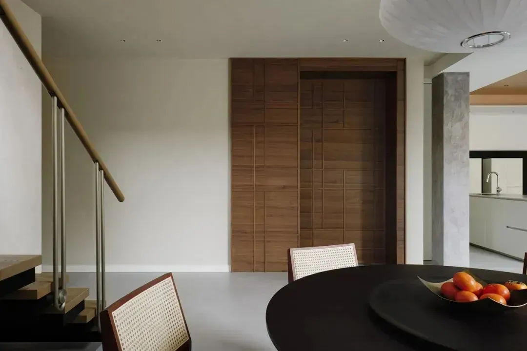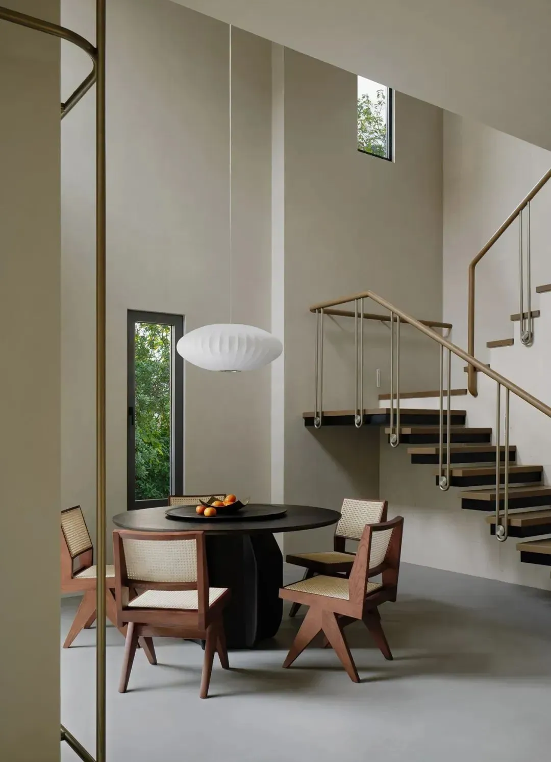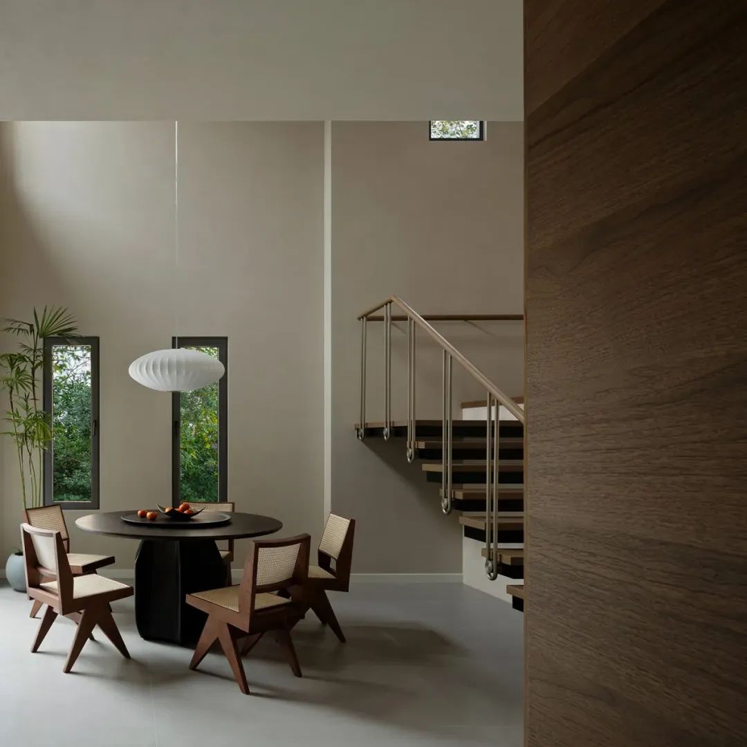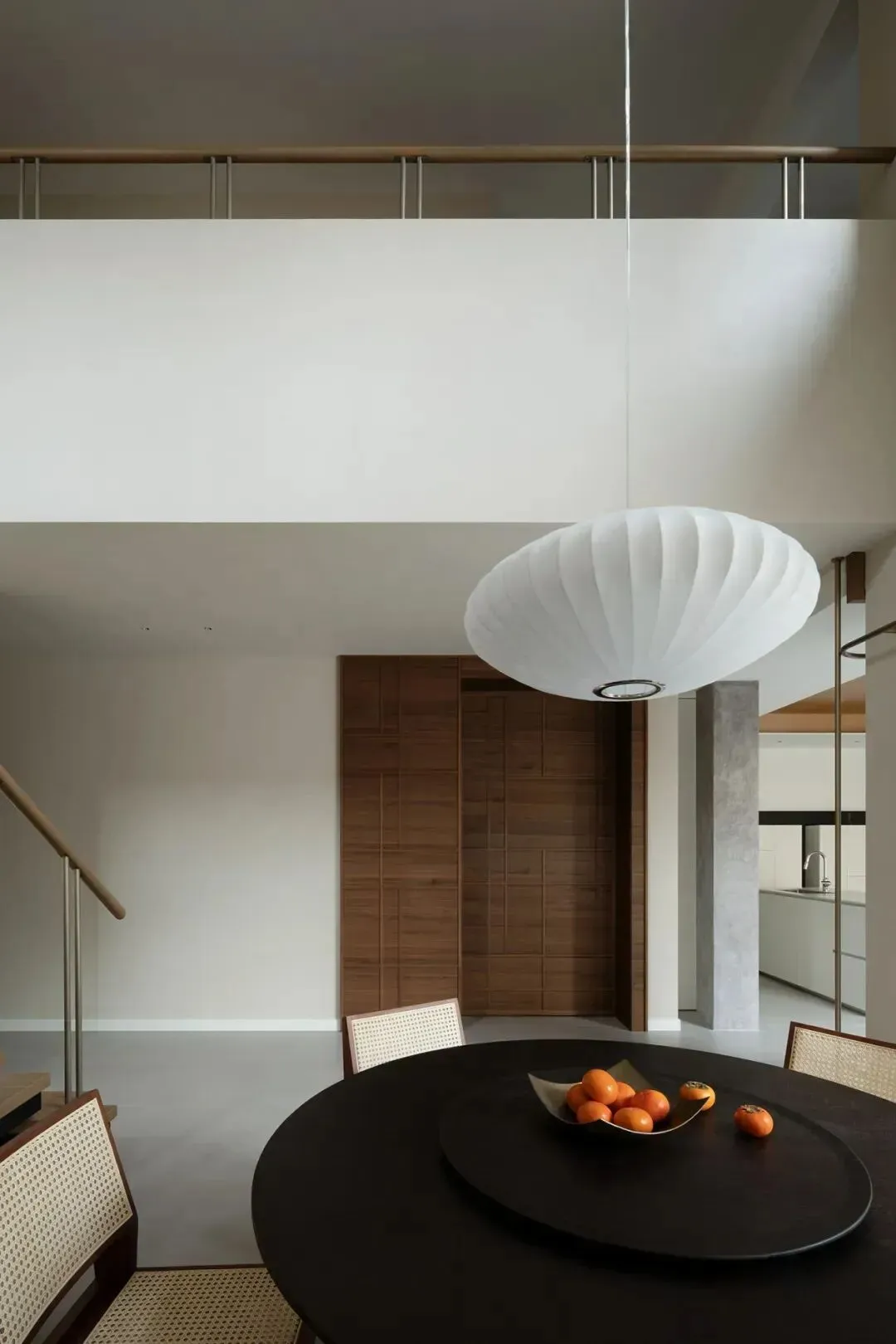 餐厅采用挑高结构处理,纵向尺度被充分释放,视线因此更加通透。下垂的吊灯以雕塑化的线条介入空间,在结构秩序中注入节奏变化,使家庭用餐的场景具备更明确的空间重心。