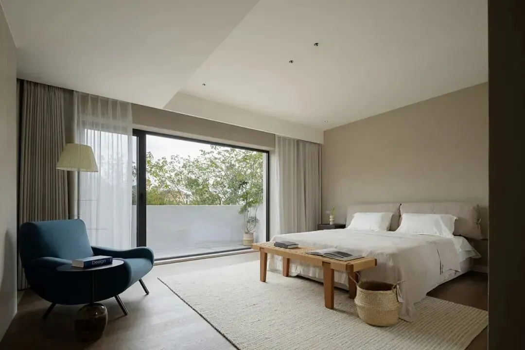 The bedroom is designed with a focus on relaxation and stability, establishing balance through the relationship between material texture and color. Large glass windows introduce natural landscapes into the interior, expanding the visual scale. The morning light falls on the surface of the fabric, creating a refreshing and calm atmosphere in the space, bringing daily life back to a more natural rhythm.