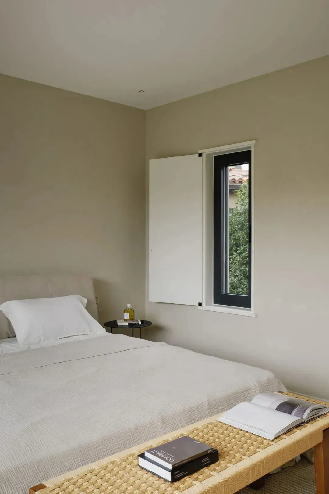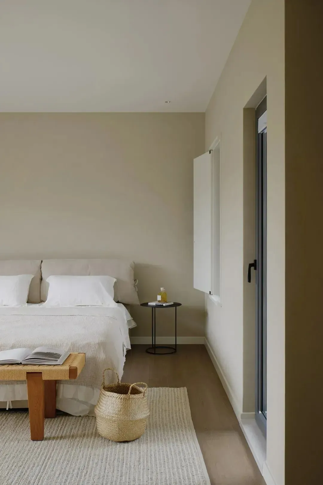 卧室以舒缓与安定为设计重点,通过材质肌理与色彩关系建立平衡。大面积玻璃窗将自然景观引入室内,拓宽了视觉尺度。晨光落在织物表面,空间气息清爽而从容,使日常起居回到更自然的节奏。