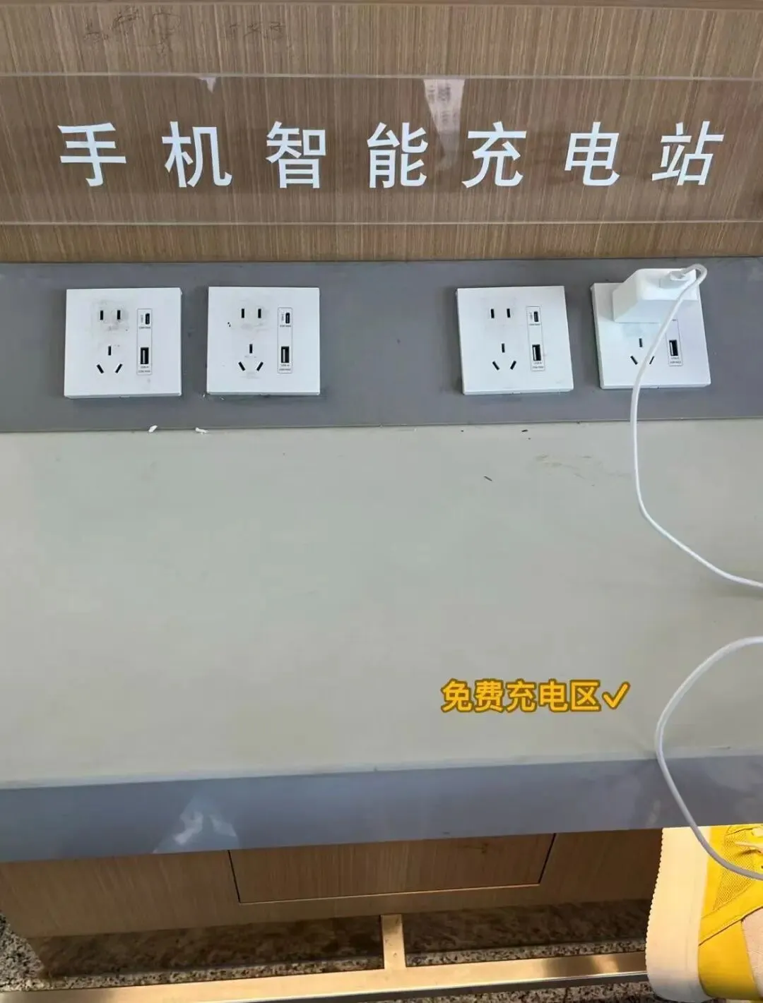 南京南站设有免费充电区,在大厅中间位置处,插上充电器就能充上电啦