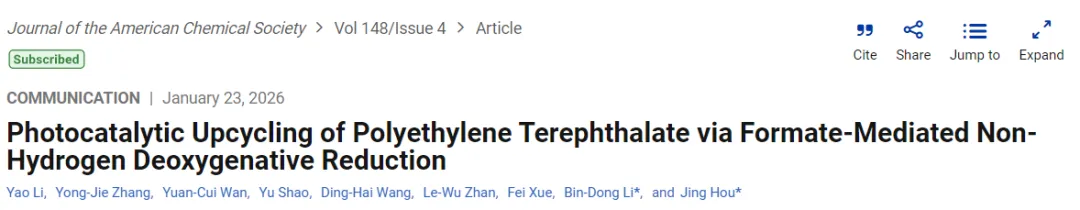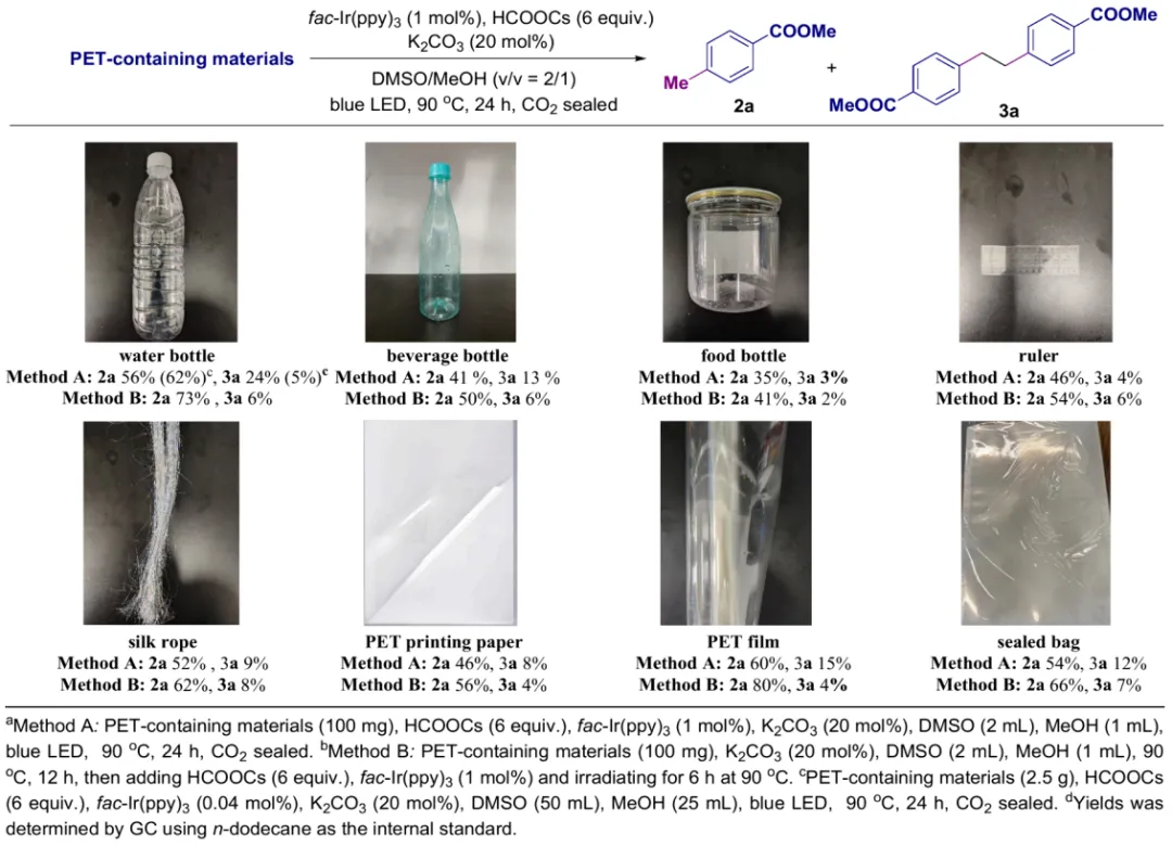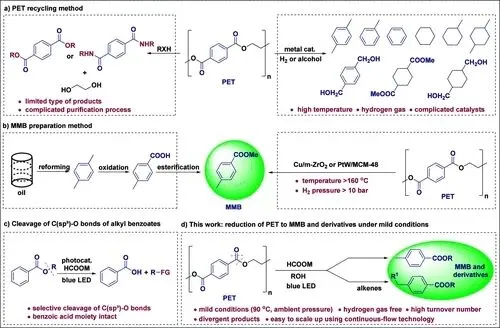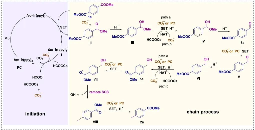 通过甲酸盐介导的非氢脱氧还原实现聚对苯二甲酸乙二酯的光催化升级回收https://doi.org/10.1021/jacs.5c20711在此,我们报道了一种前所未有的光催化方案,该方案以甲酸盐为还原剂,用于苯甲酸酯及其衍生物的选择性脱氧还原。利用这一新颖且高效的方法,成功实现了聚对苯二甲酸乙二酯(PET)的升级回收,在温和且无氢条件下生成了对甲基苯甲酸烷基酯。机理研究表明,该转化过程由连续单电子转移(SET)与远程自旋中心转移(SCS)的协同作用所驱动。通过连续流动反应器可轻松实现克级合成,凸显了其实用潜力。聚对苯二甲酸乙二酯(PET)是应用最为广泛的聚酯塑料之一,年产量超过7000万吨。因此,其不可降解性导致PET废弃物产生,造成严重的环境污染。因此,开发有效回收和升级利用废弃PET的方法,对于缓解塑料废弃物问题至关重要。与机械回收(常导致聚合物性能下降)相比,化学回收是一种将PET废弃物转化为有价值化学品的颇具前景且适用于工业生产的方法。传统化学回收工艺包括乙二醇解,水解,甲醇解,氨解,和氢硅化,可生成单体(方案1a)。近年来,废弃PET的催化加氢裂解已成为通过一锅法或多步工艺获取还原产物(如环烷烃、对二甲苯和1,4-苯二甲醇)的吸引人方法(方案1a)。尽管取得了这些开创性进展,但此类方法通常需要苛刻条件,包括高温和易爆的氢气。因此,开发能在温和条件下生产有价值化学品的可持续化学升级回收方法仍是一项重大挑战。对甲基苯甲酸甲酯(MMB)是多种精细化学品的重要构建单元。传统MMB生产工艺包括用浓硝酸或过渡金属催化剂氧化石油衍生的对二甲苯(PX),随后与甲醇进行酯化反应(方案1b)。然而,这些方法存在化学选择性差和环境污染严重的问题。2024年,Li及其同事报道了使用非均相Cu/ZrO₂催化剂对PET进行催化加氢裂解,通过两步工艺以MMB为主产物(方案1b)。随后,Mei团队描述了使用双功能PtW/MCM-48催化剂对废弃PET进行加氢反应,生成对甲苯甲酸和对二甲苯的混合物(方案1b)。然而,这两种方法均需要高温(>160°C)和高氢压(>1 MPa),增加了操作成本和安全风险,从而限制了其工业应用性。