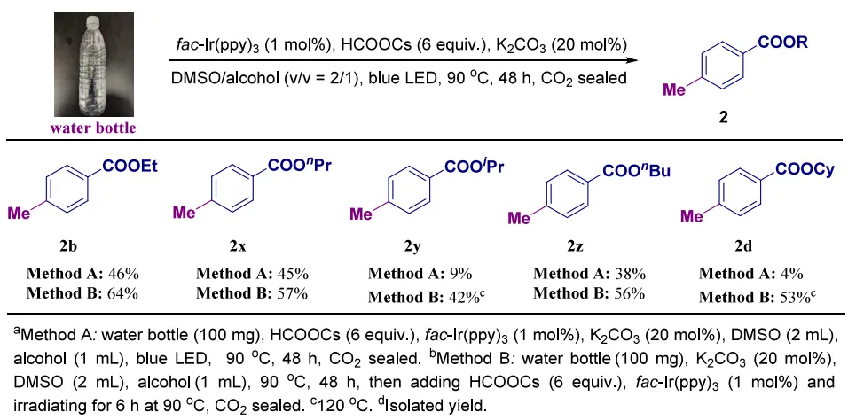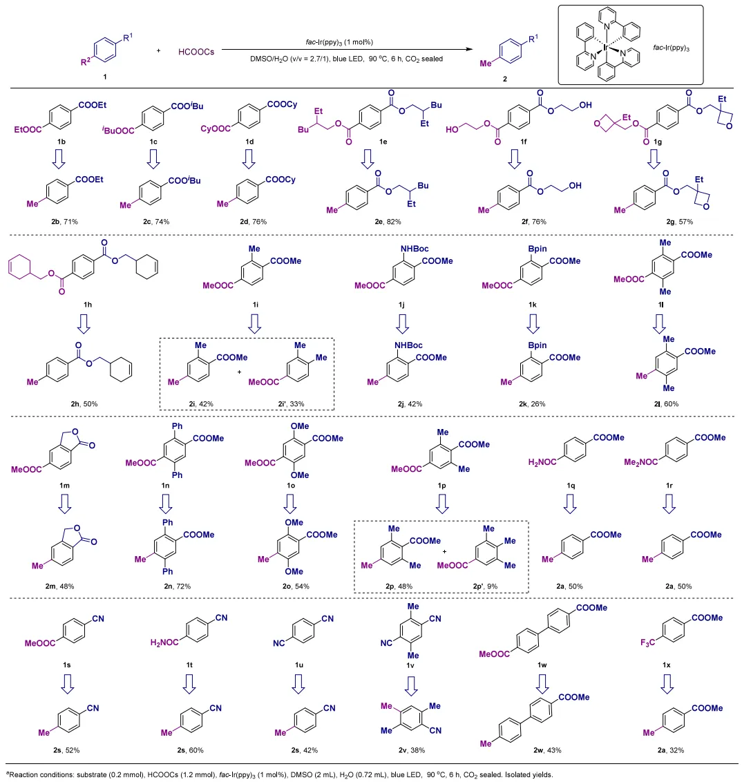 本研究以对苯二甲酸二甲酯(DMT)1a为模型底物展开。我们以甲酸铯(HCOOCs)为还原剂、二甲基亚砜(DMSO)为溶剂、面式三(2-(2-吡啶基)苯基)铱[fac-Ir(ppy)₃]为光催化剂,在90°C蓝色LED照射下进行反应。考虑到二氧化碳(CO₂)的存在可能通过CO₂与CO₂•⁻之间的平衡稳定所提出的中间体CO₂•⁻,我们在密闭的CO₂气氛下进行了反应。有趣的是,我们发现通过增加甲酸铯的用量,选择性脱氧还原反应虽产率适中但仍可进行(表1,条目1和2)。值得注意的是,加入H₂O(100当量)作为添加剂,可得到51%的目标产物产率(条目3)。继续将H₂O用量增加至200当量(VDMSO/VH₂O = 2.7/1),产物产率达74%(条目4)。我们推测,H₂O可能作为有效的质子源,促进了C–O键的还原和裂解。然而,当向体系中加入大量H₂O(600当量)时,由于底物和催化剂的溶解性问题,转化反应受到抑制(条目5)。该还原反应效率高,6小时即可完成(条目6)。甲酸钾(HCOOK)也可作为还原剂,但产率较低(条目7)。产率受到显著影响可能有两个原因。首先,甲酸铯的溶解度高于其他甲酸盐。此外,反离子可能在稳定CO₂•⁻方面发挥关键作用。用Ir[ppy(dtbbpy)₂]PF₆替代fac-Ir(ppy)₃导致产率降低(条目8)。与我们对CO₂气氛作用的假设一致,在氩气或空气气氛下进行反应时,产率下降(条目9和10)。