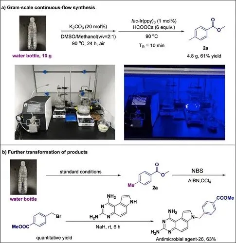 方案7. 将PET转化为对甲基苯甲酸甲酯(MMB)和对甲苯甲酸的方法总之,我们开发了一种新型可见光介导、非加氢策略,用于将聚对苯二甲酸乙二酯(PET)选择性升级回收为高附加值的对甲基苯甲酸甲酯(MMB)及其衍生物。与已报道的方法相比,新方法可在温和条件下使用市售催化剂实现升级回收,且产物产率良好(方案7)。使用连续流动反应器成功实现克级合成,凸显了其在工业规模应用中的潜力。机理研究表明,该反应通过一种前所未有的路径进行,涉及连续单电子转移(SET)和远程自旋中心转移(SCS)。我们预期,这一方案将为PET废弃物的升级回收开辟新途径。