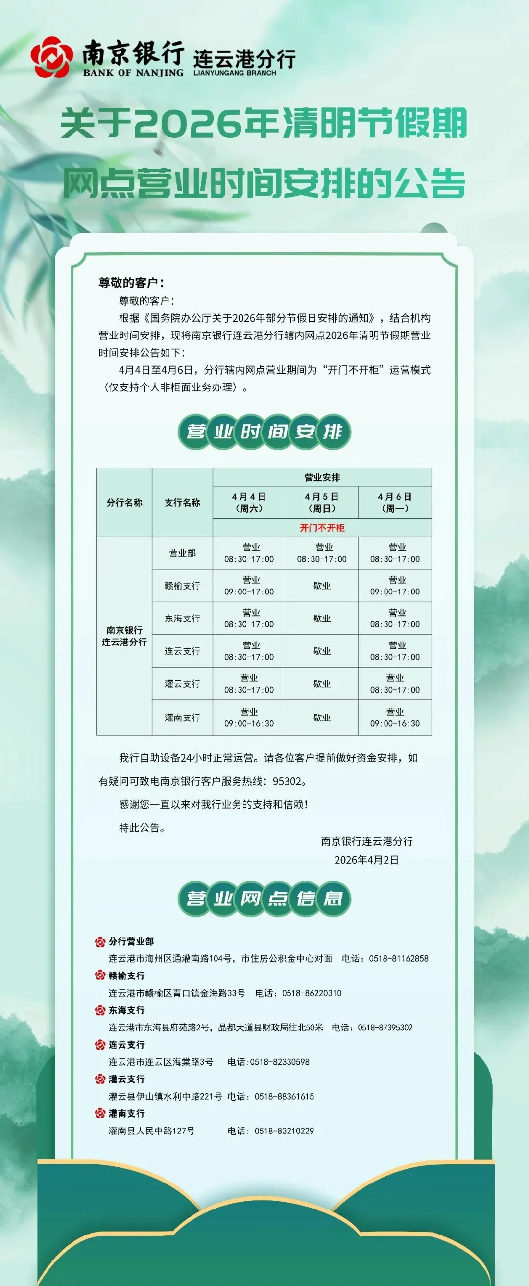 南京银行连云港分行2026年清明节假期网点营业时间安排公告