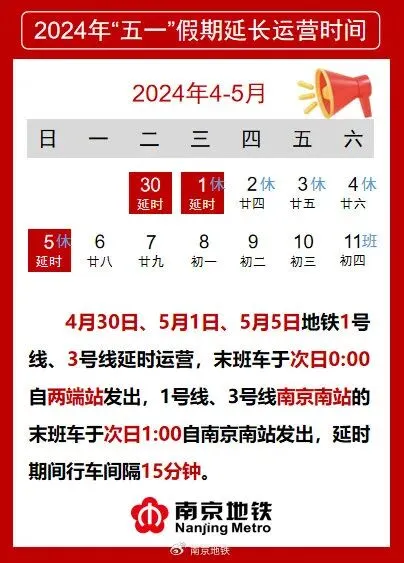 为方便乘客的晚间出行,同时做好南京站、南京南站主要铁路枢纽的客流衔接,4月30日、5月1日、5月5日地铁1号线、3号线延时运营,末班车于次日0:00自两端站发出,1号线、3号线南京南站的末班车于次日1:00自南京南站发出,延时期间行车间隔15分钟。5月2日至5月4日线网各线路维持正常运营时间。