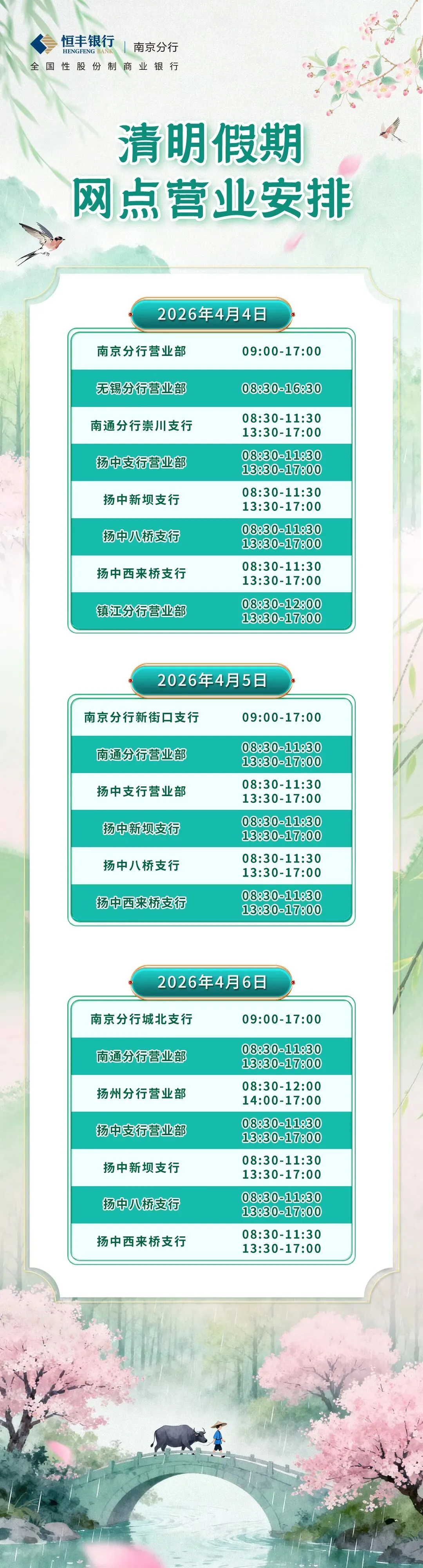 正值2026年清明节,根据国家法定节假日安排,我分行营业网点清明节假期期间(2026年4月4日至4月6日)营业时间有所调整。为方便您办理业务,现将我分行营业网点营业期间对外营业时间安排公告如下: