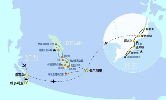 南京出发加拿大东西海岸全景13日,这是一份早已为你规划妥当的完美路线,一场穿越佳境纵览自然奇观与都市风情全景体验。